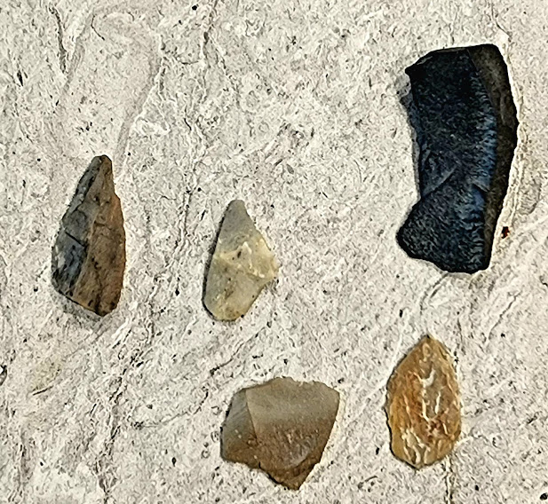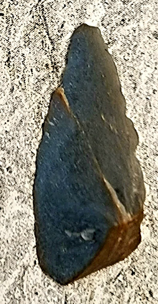 The arrowhead's on the left, the black stone on the far right is a curiosity, curved, shows definite signs of knapping, heavy, harder, not local.