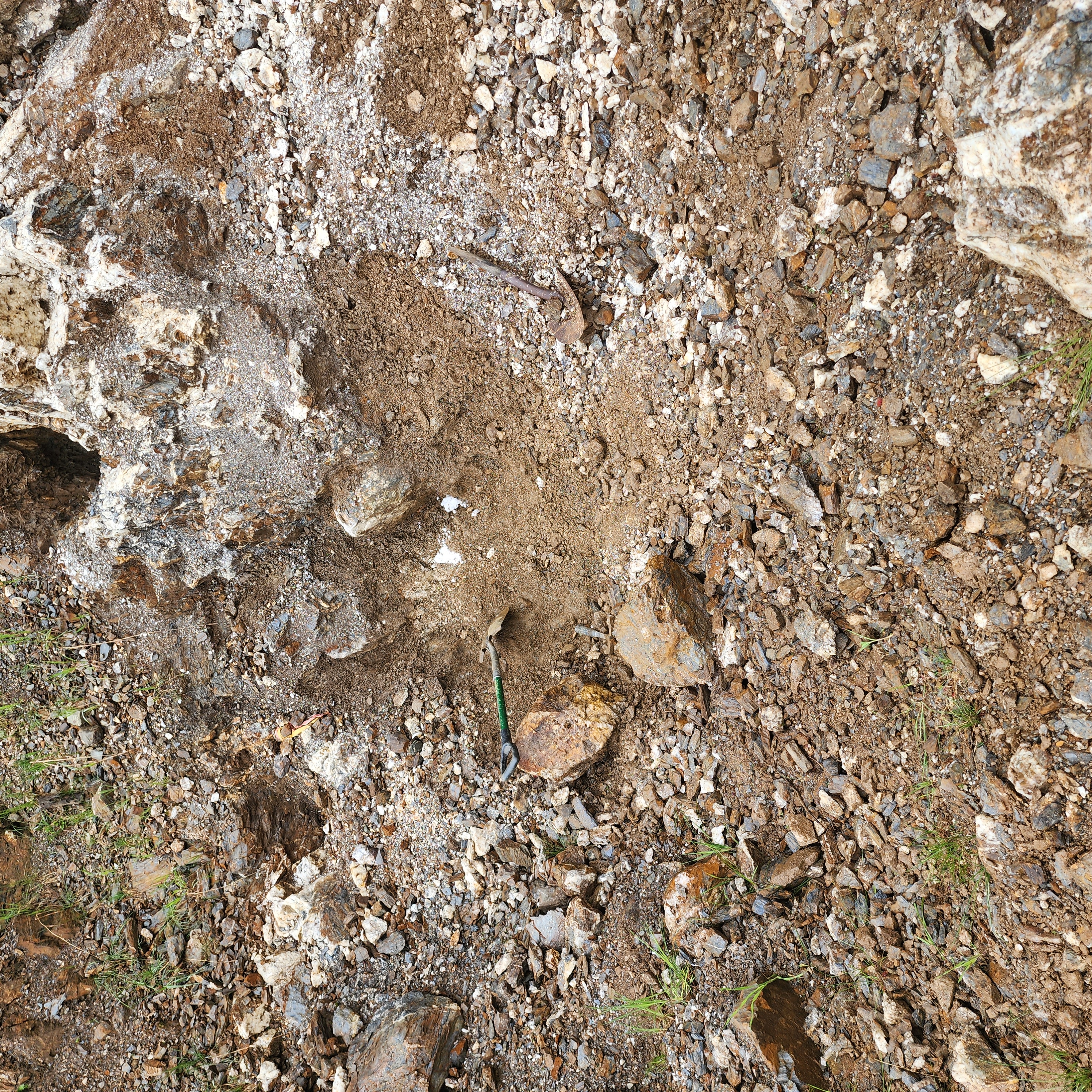 The next day, rainy, grey again, I'm filthy in a matter of hours. Dig down to bedrock, search for new pockets. Nada. I do a good job of baring a few meters, but - nothing. And so I go through the dirt I've dug, go back to a few vugs, clean them out again.