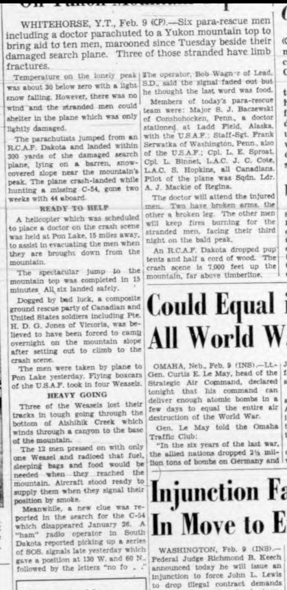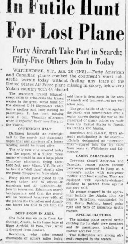 Articles here: https://en.wikipedia.org/wiki/1950_Douglas_C-54D_disappearance and here http://www.ruudleeuw.com/search137.htm and here: https://www.warhistoryonline.com/cold-war/disappearance-of-a-usaf-c-54.html
