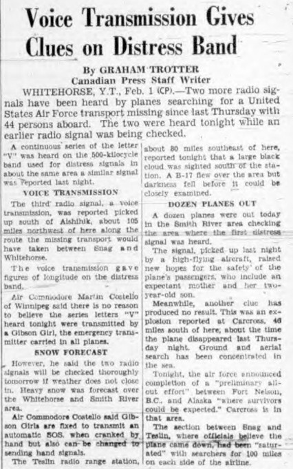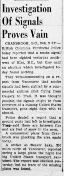 What is especially curious is the fact that intermittent SOS/distress calls were picked up for 2 weeks following the plane's disappearance, implying that it may have not met with a fiery end (as reported by one warden who reported hearing a "boom"), it may have landed relatively intact and the 44 occupants perished awaiting help. Cold weather, clouds and snow hampered search efforts and quite possibly the plane was entirely covered over and so went unspotted. Another is that it landed on a lake - and come spring sunk to the bottom with it's passengers. There are a few tales like this - try: https://www.cbc.ca/news/canada/calgary/baker-lake-bristol-freighter-underwater-discovery-1.4814719.