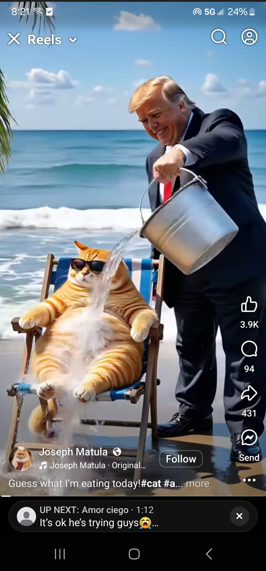 This; a screenshot of Trump pouring water on Orange Cat's vacation.