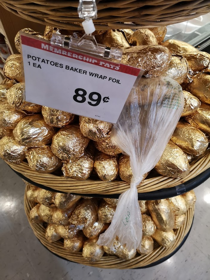 I mean, I might be day-tripping but the daughter is laughing as well, a buck for a gold-foil wrapped potato. This is absurd. This is man-shopping, too lazy and stupid to buy a bag of potatoes someone out in a hurry to get the barbecue going buys these, the gilded foil must be to elevate them above the status of regular foil-wrapped potatoes, justifying the 4, 5, 10-fold increase in price. And the plastic bag with a potato in it is proof there's no overestimating human stupidity...