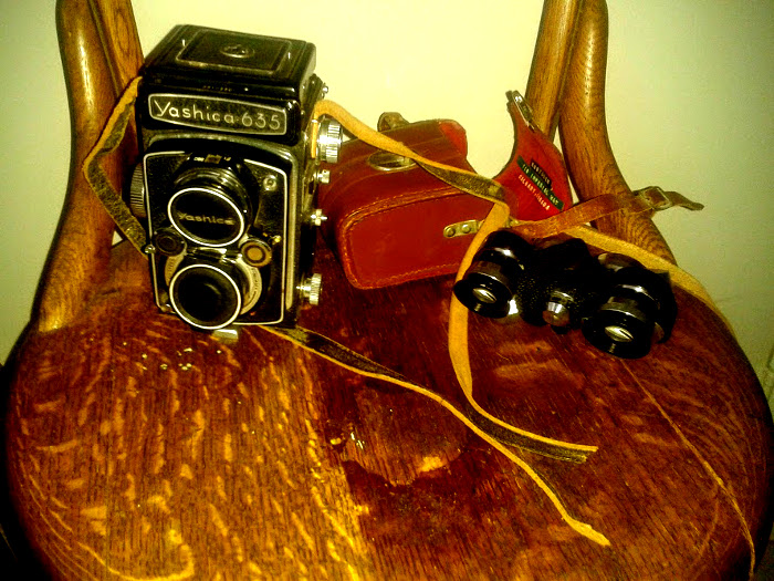 A Yashica 635 120 format camera, adaptable to 35mm, and a pair of Jupiter Sr. Binoculars. Heavy for such small optics. All in all, not a bad day...