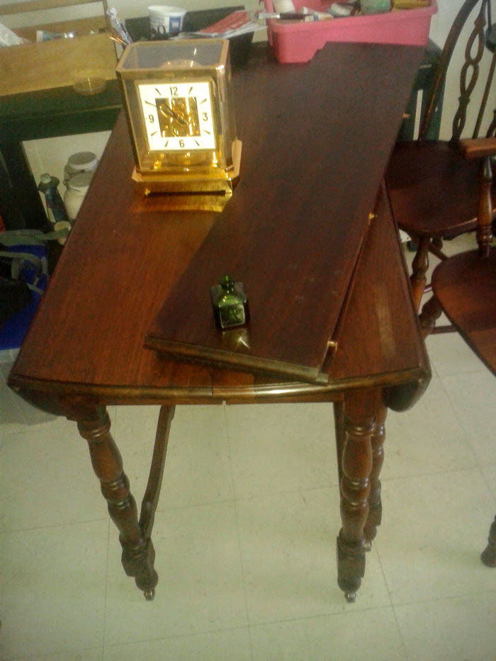 This makes my day, but there are still a few places left on my list, off to the K of C rummage sale a few blocks away...And here I pick up a gate-leg table with 4 chairs, $150.00. It's 8:56 and that completes my day...
