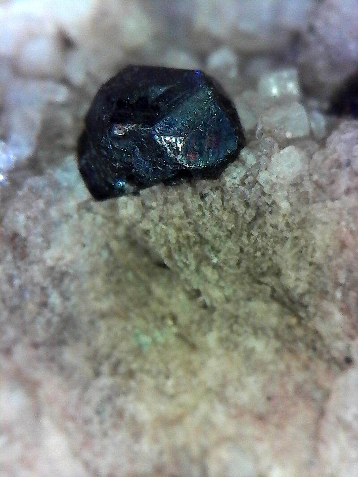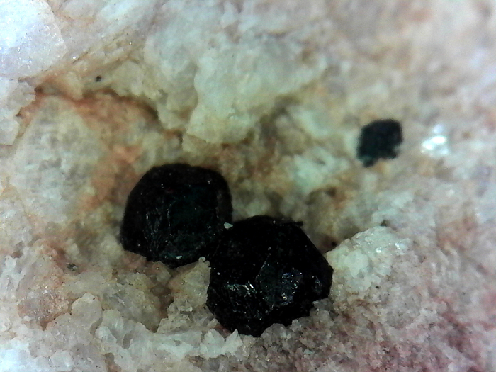 Perfect specimens of minute bits of black garnet on quartz matrix. By minute I mean neither of these garnets would approach a mm in size, tiny, amazed I spotted them really, but they stood out in the grey uniformity of glacial till, limestone and mudstone....