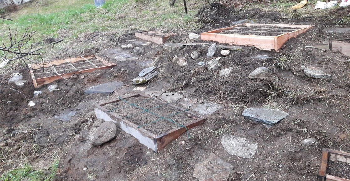 Built, installed boxes, terraced hillside to hold, dug out and in stone flagging, dug out fire pit (edge of ring lower right)