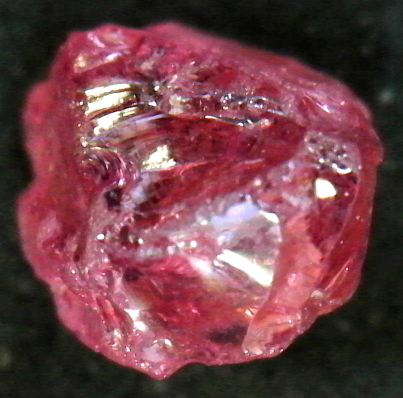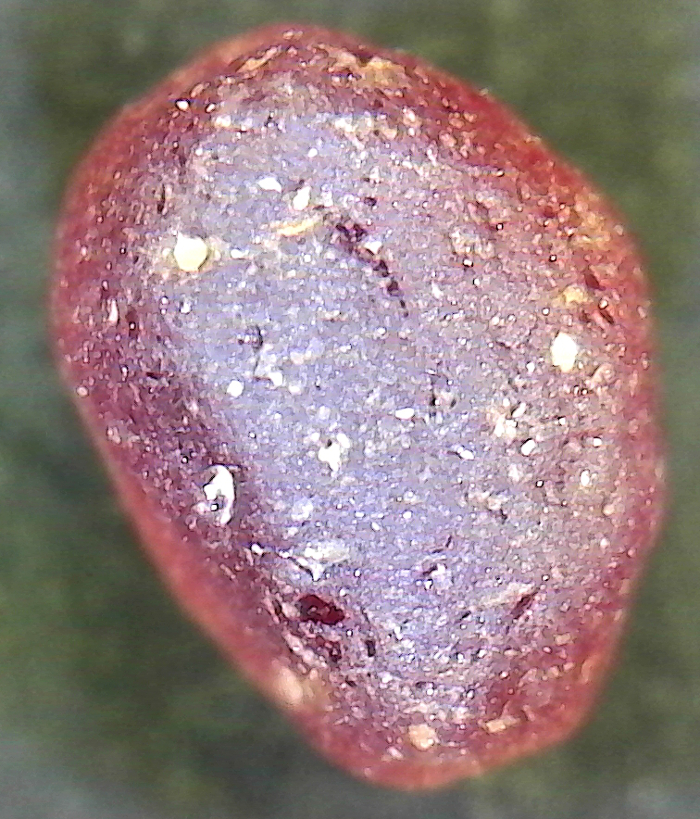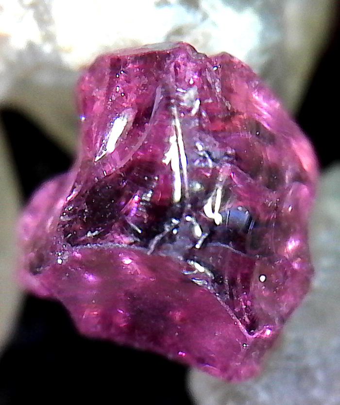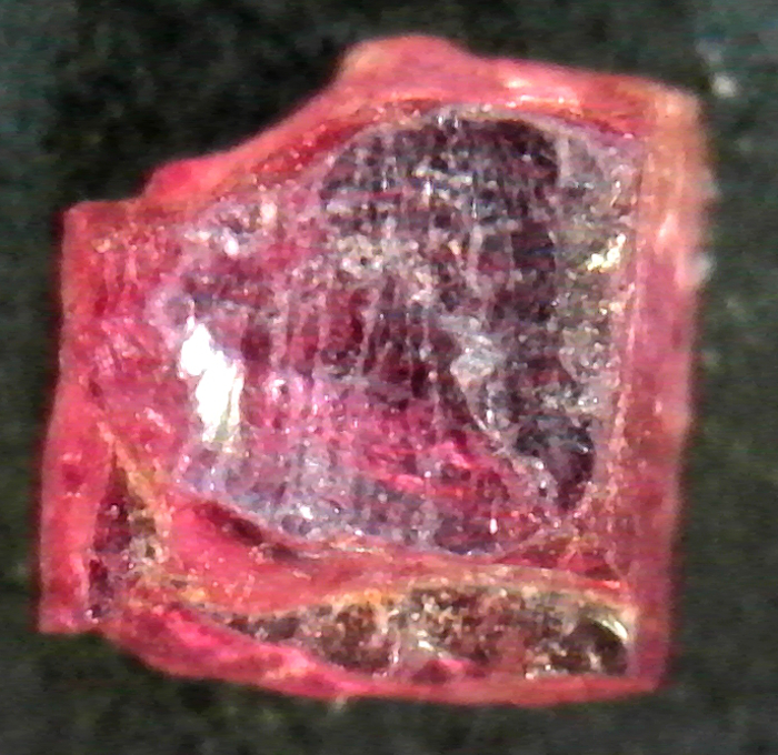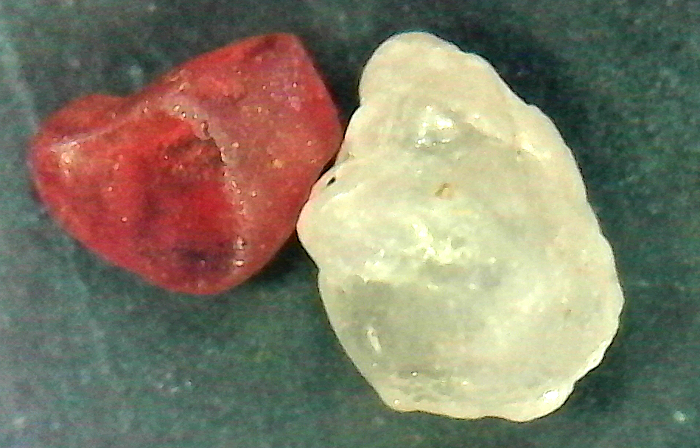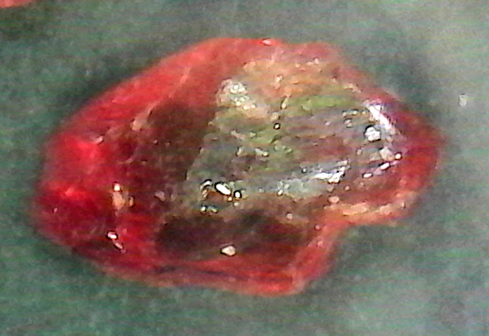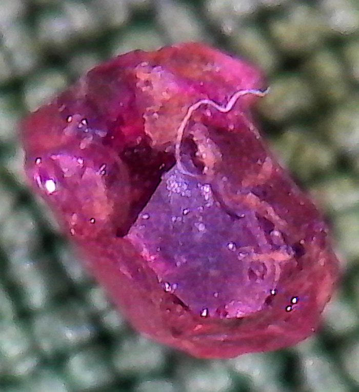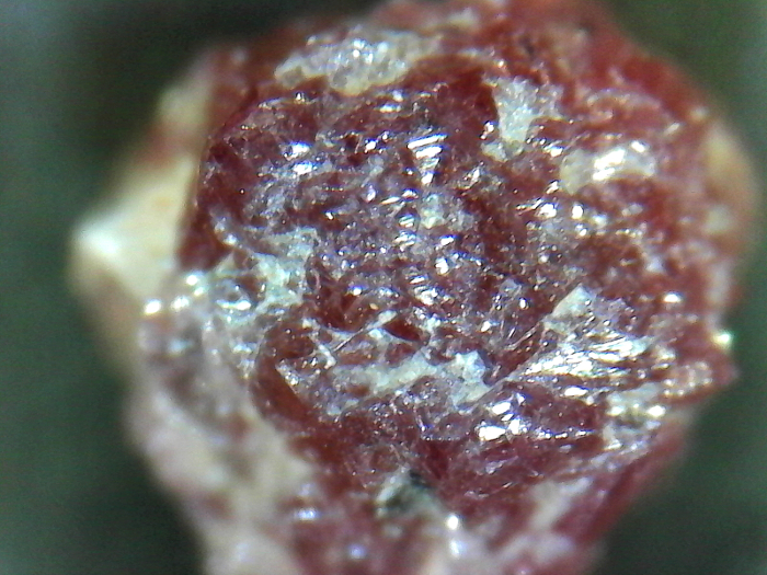 This, of the more ruby red variety, note the crystal shape (eroded), doesn't seem to be that of garnet...
