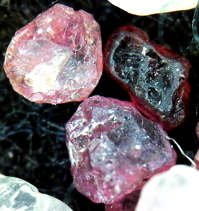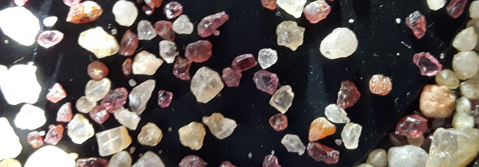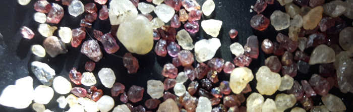 quartz, garnet, maybe another garnet but that deep red, is it pyrope or...? And the red ones, heavier by far, always in the bottom of the pan, they were the biggest, a few in the 3 or 4 carat range, definitely big enough to be cabachoned or faceted.