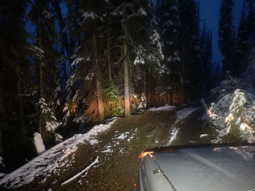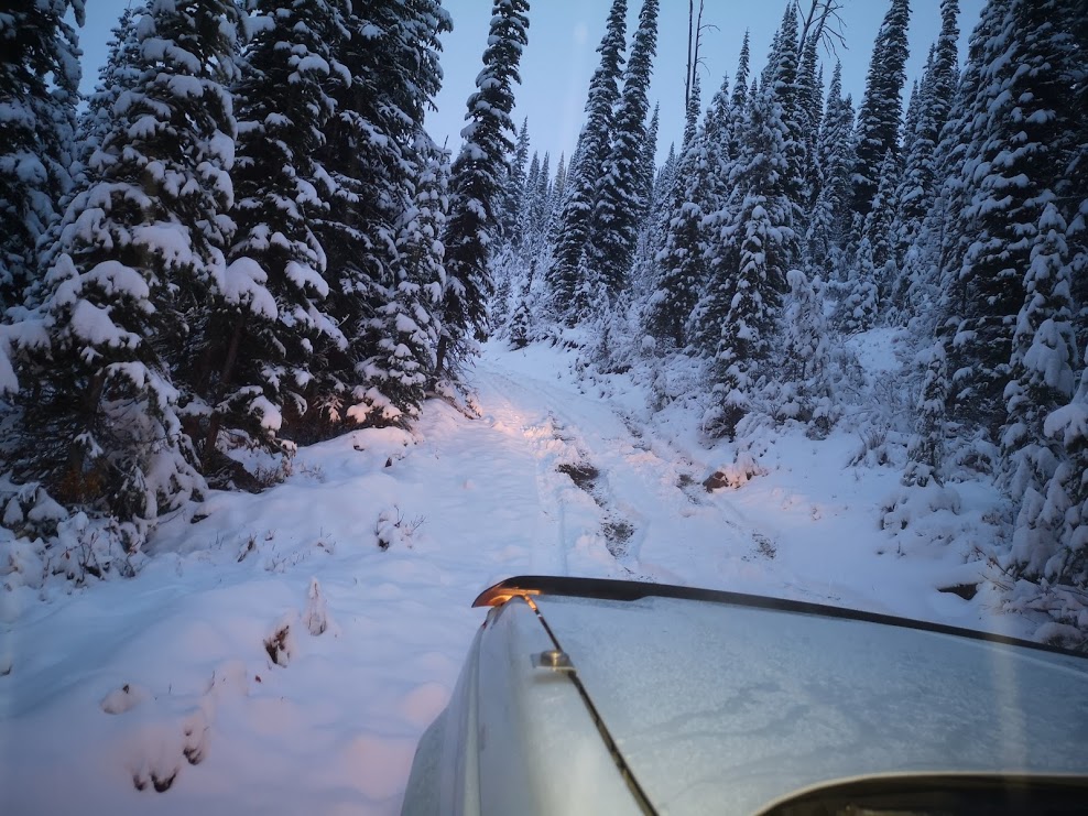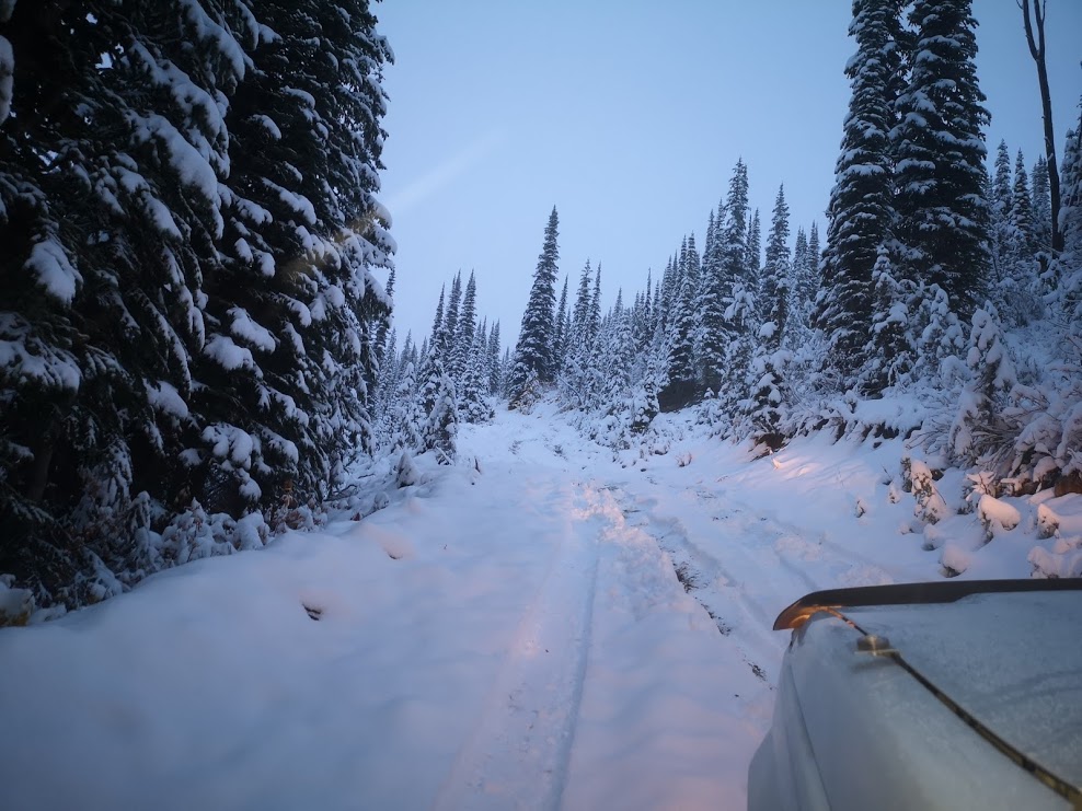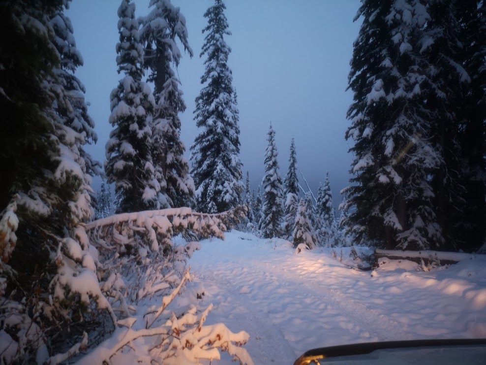 Finish work, grab some supplies, head North. A 3 hour drive, up the mountain, and I'm 6 KM up, slight traces of snow. But, the next climb it begins, at first a single centimeter, then an inch, then two, three, four, and then, the jeep isn't going any further, wheels spinning...