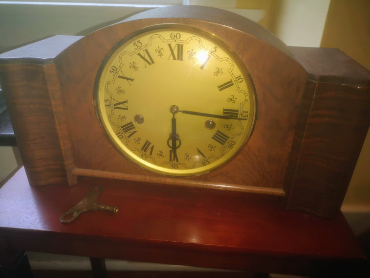 Wind it to discover that the clock is working fine, chimes "Oranges and Lemons" or some such very recognizable melody on the hour, out perhaps 10 minutes per day - a minor adjustment, and now I'm stuck with it. When it winds down I'll pull the face, paint over it, give the clock some life and color, and then live with it.