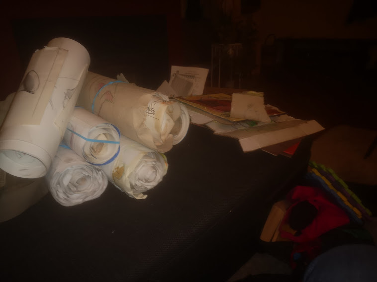 In the end, very little worthwhile - 100+ scrolls of cartoon women with big bazooms looking like they'd been steamrolled, like what happened to Coyote with Roadrunner, bazooms aiming east and west, quick sketches, no real effort, he just has to get it out. These I will sell in the "Stormy Gift Shop" for the very reasonable price of $10-$20.00 Apiece. While it doesn't look like much it takes hours to look at each one and reroll it - and separate it from the rubbish - the garbage to be returned (and he will tell me "but it was Marilyn's favorite...." or "It was for Noah/Eve/Ms...".) Bollocks - I drop it off at his place, he can take it back to the free pile from whence it came, only - and I'm getting a phobia of calling round - there's more rubbish.