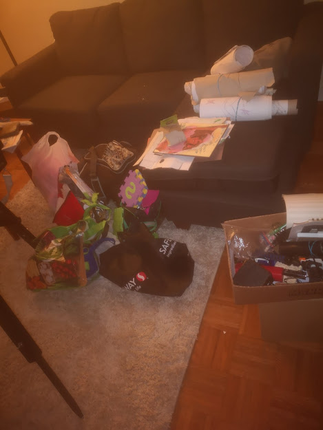 While there I watch the neighbor. The lady on the corner is walking about with 2 wireframe record stands, a TV dinner table. Taking them inside her corner house. Probably a find from a Nelson Free Pile.