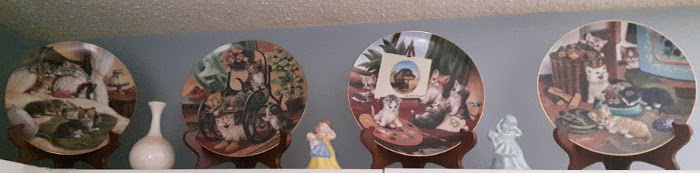 There are the innumerable stuffed animals, the kind you won at fairs a long time ago, stuffed with sawdust, and there are the trophies (bowling, other), old family photos, there are the "collector plates" painted with kittens and statues of princesses and kittens all mounted upon the shelves and ledges...