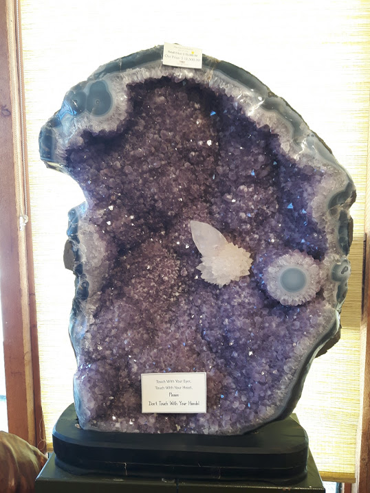 A four foot tall Amethyst geode, from Brazil, with amazing quartz or Calcite crystal in the middle. If you were religious this would be proof of God. And, hard to believe, I know, but cheap at a mere $15, 000 Canadian. And I mean cheap, this is an amazing piece, museum quality...If I won 10 million dollars I'd buy it for my locker and pay somebody to clear a spot for it...