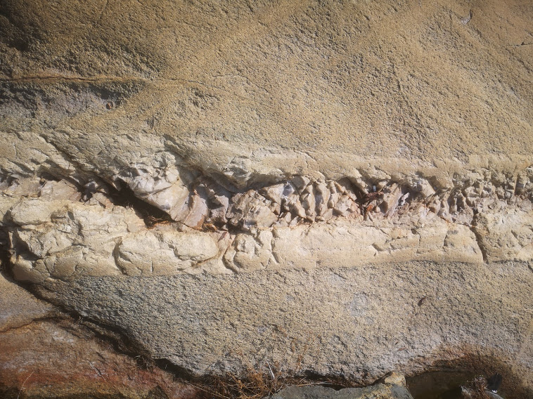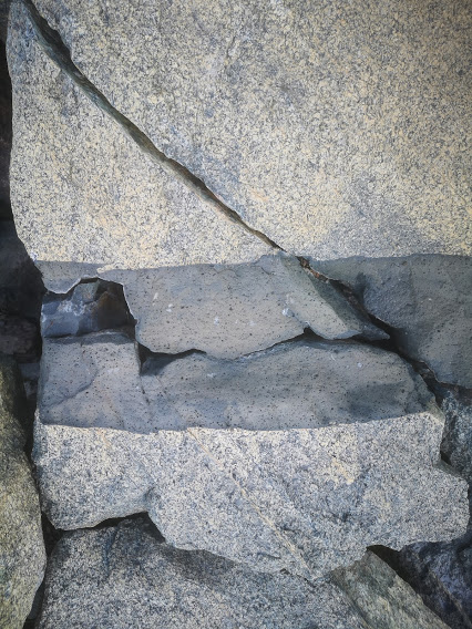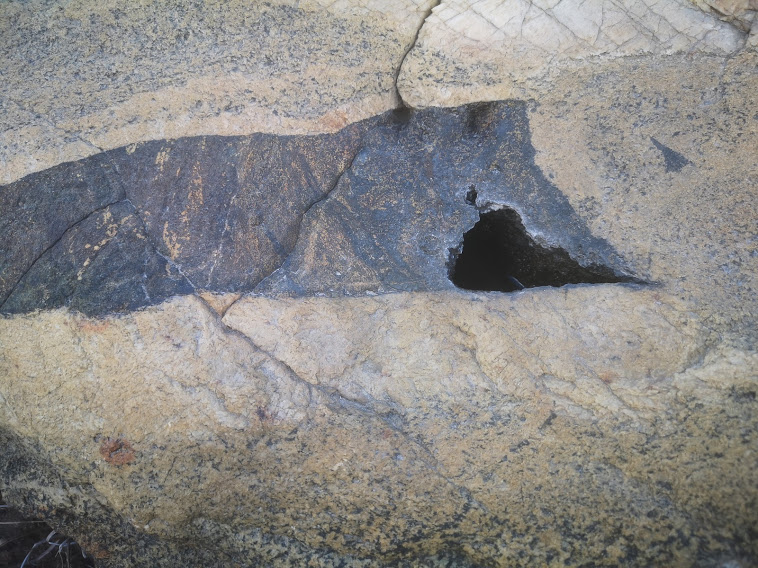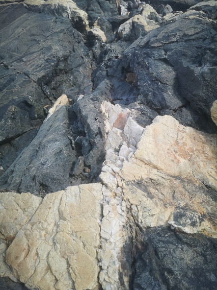 Coarse feldspar sills, smoky quartz, granular crystals like pegmatites but lacking in the mica and other minerals. The basalt has cooked out the minerals - clear divisions and cavities in the rock.