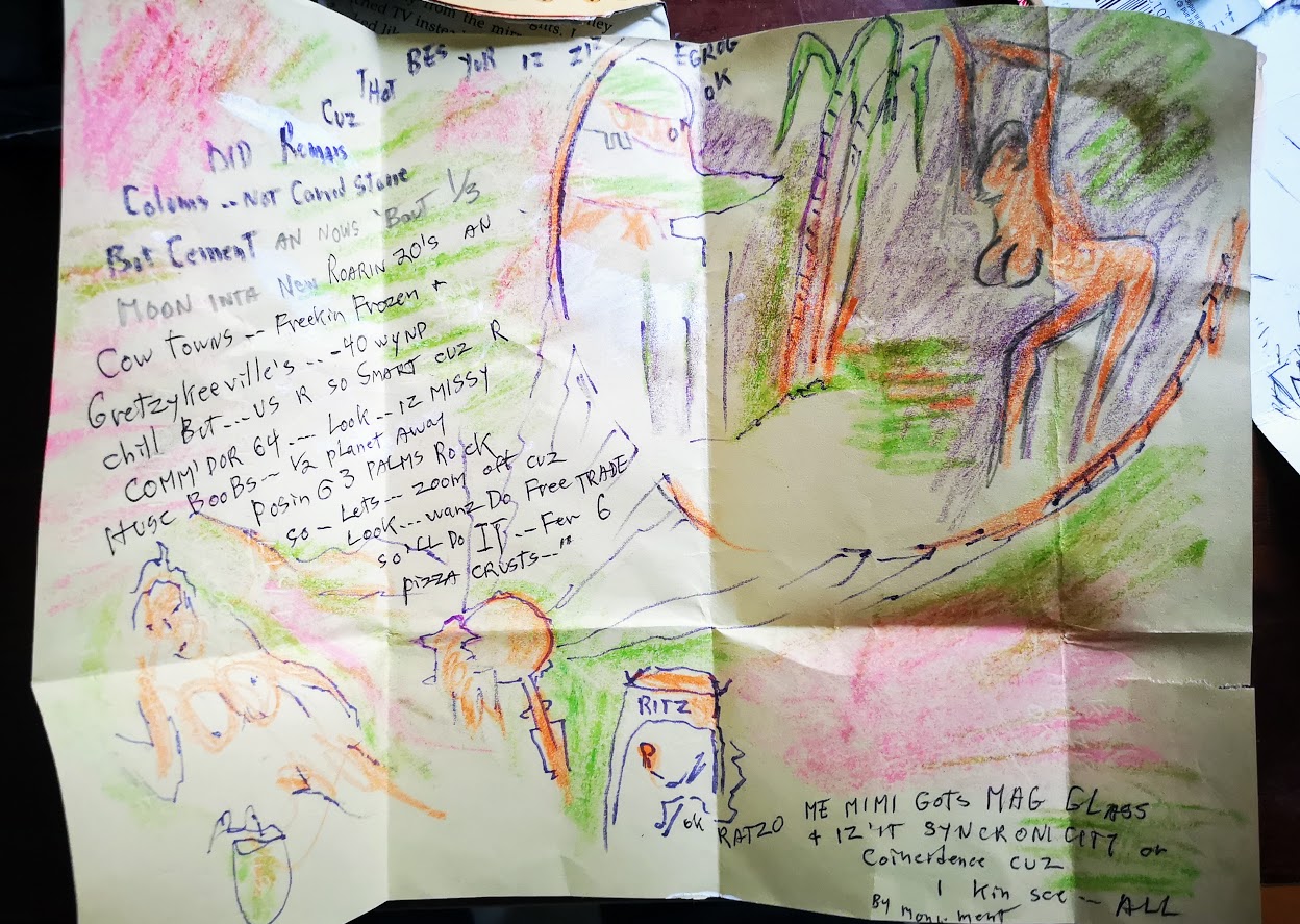 A proper mixed-media assemblage (of postcards and photos that I'd sent him...nothing goes to waste!!)
