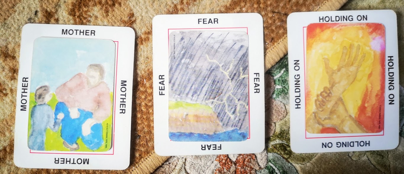 The next, 3 large cards drawn from the "Oh" deck, with 3 small image cards lain on top.