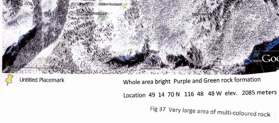 It's gold, everything from the "untitled placemark" to the "Whole area bright Purple and Green rock formation" and the slanted pasted on Fig 37. He didn't actually climb up to the rock, he's just trying to imply it's fluorite.