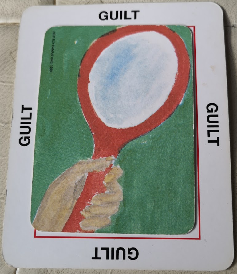 Finally - the one card reading (two - but they'll be combined) - the first card, flipped over - reads "GUILT". The second, smaller card has an image of a hand holding a mirror.