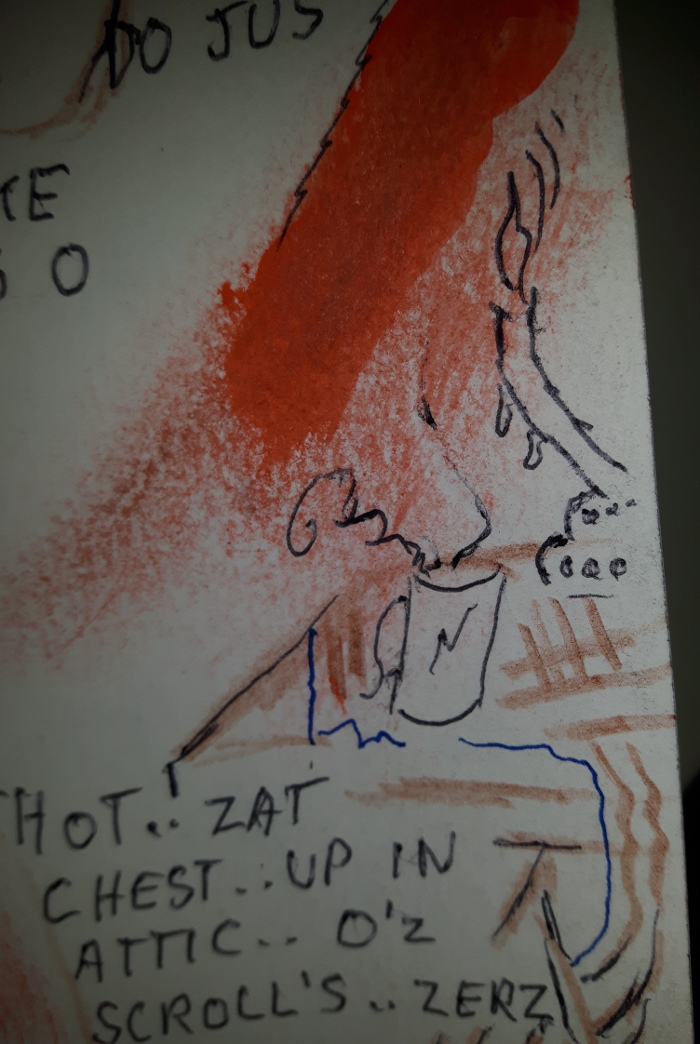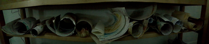 Meanwhile - I'm forbidden from copying his artwork, but I've taken a picture of the job lot of scrolls against the backdrop of other written ephemera, you can open in new tab and embiggen and you'll get an idea of what he's about...and they're double sided every one!