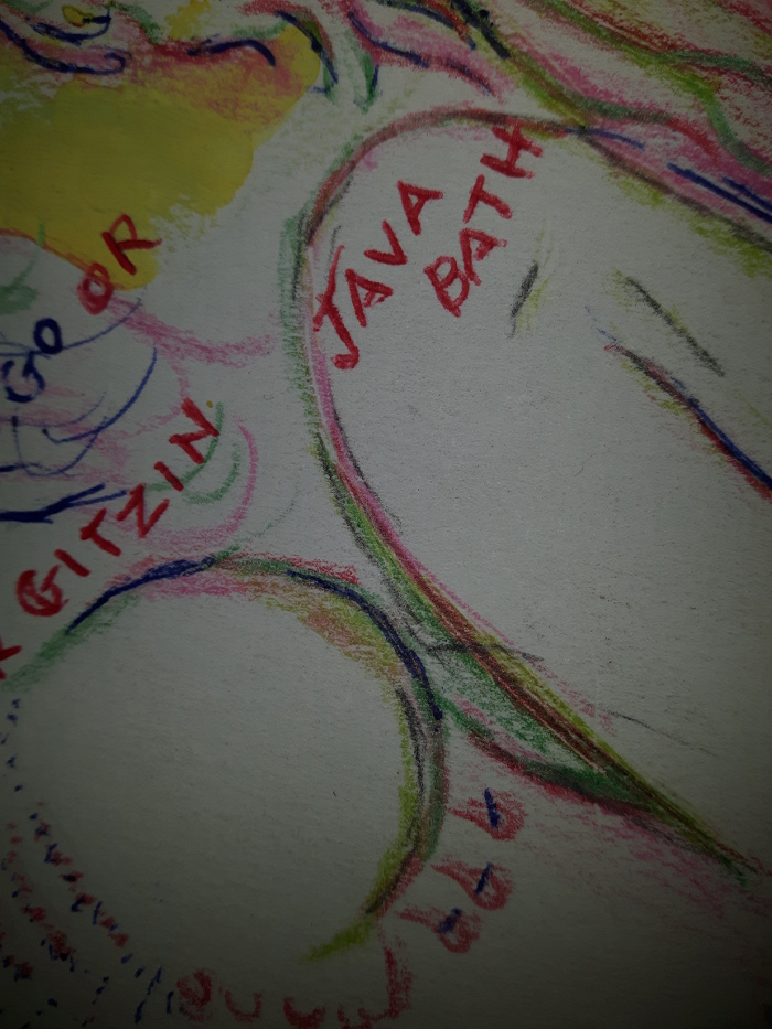 And every night after work, or after the days adventures I return to the dungeon to find he's left me a present - more rants - on paper coffee cups, tourist literature, drawings - on paper - gifts - a pair of new black steel-toed Timberlands - size 9 1/2 - about 2 sizes too small...