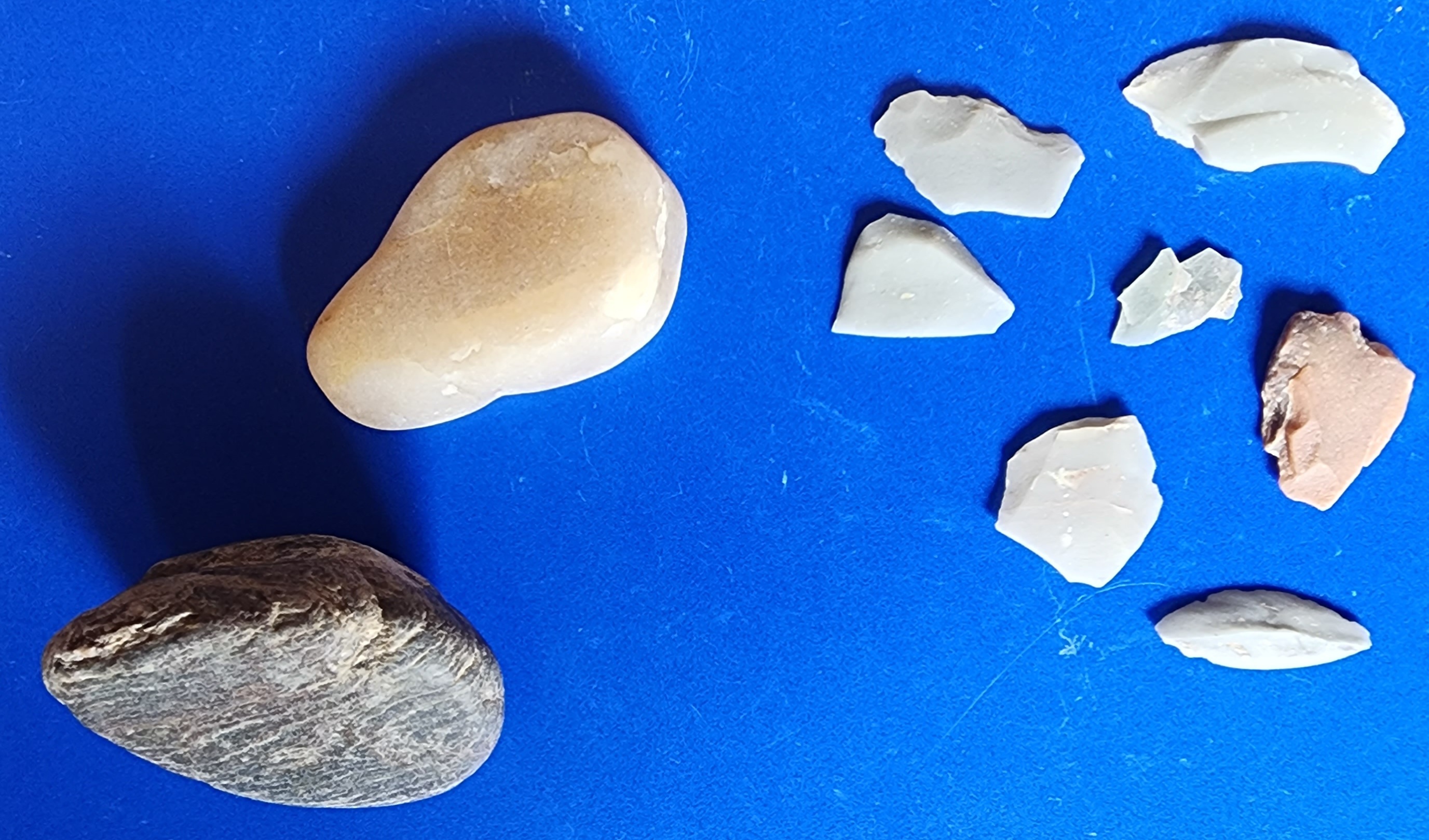 Bottom left - petrified wood? upper left - agate - right, various chert flakes, lower right - the ovoid - looks suspiciously to me like an arrowhead. A bird point, none to glamorous, but - when the lake recedes I'm looking for a whole pile of new treasures to be exposed...