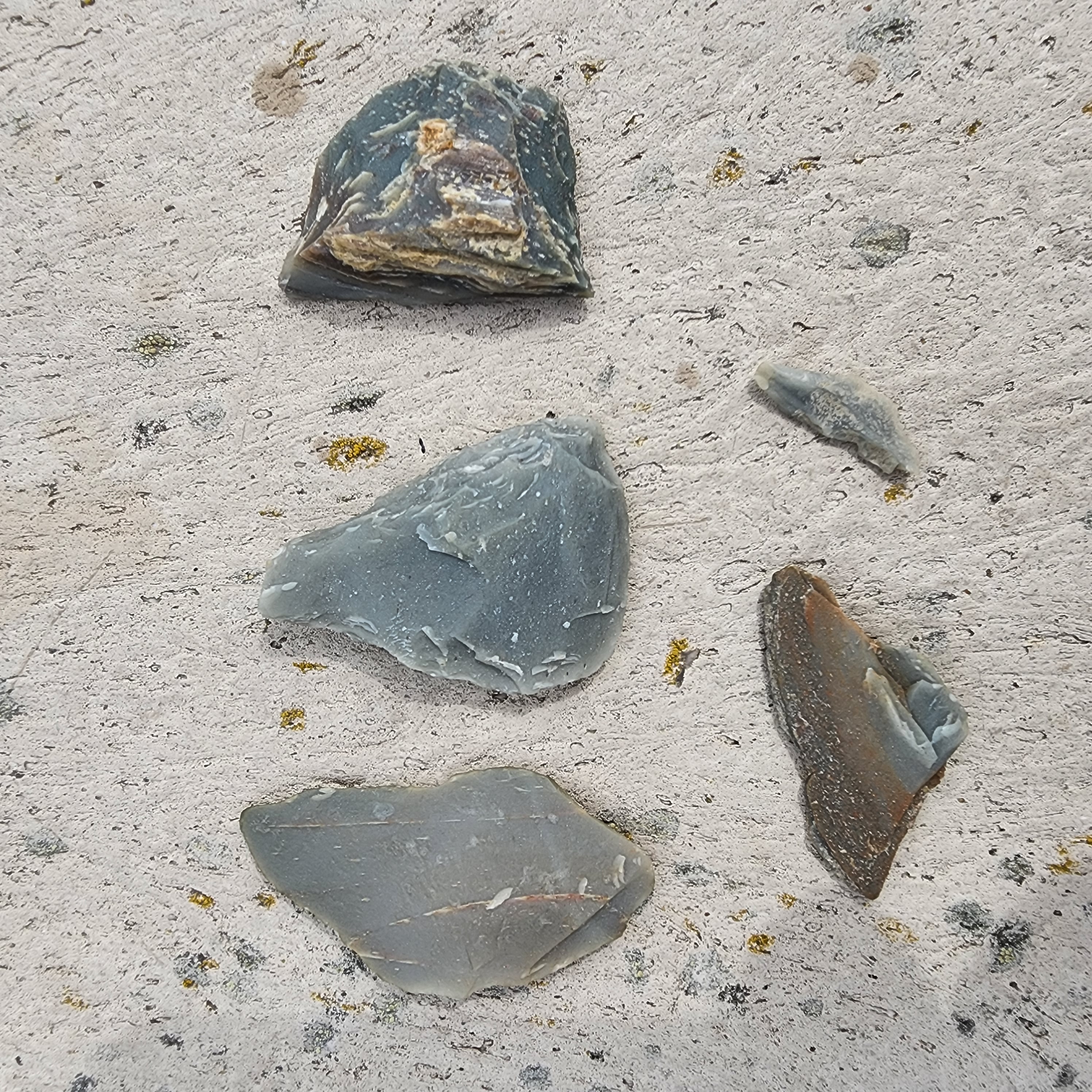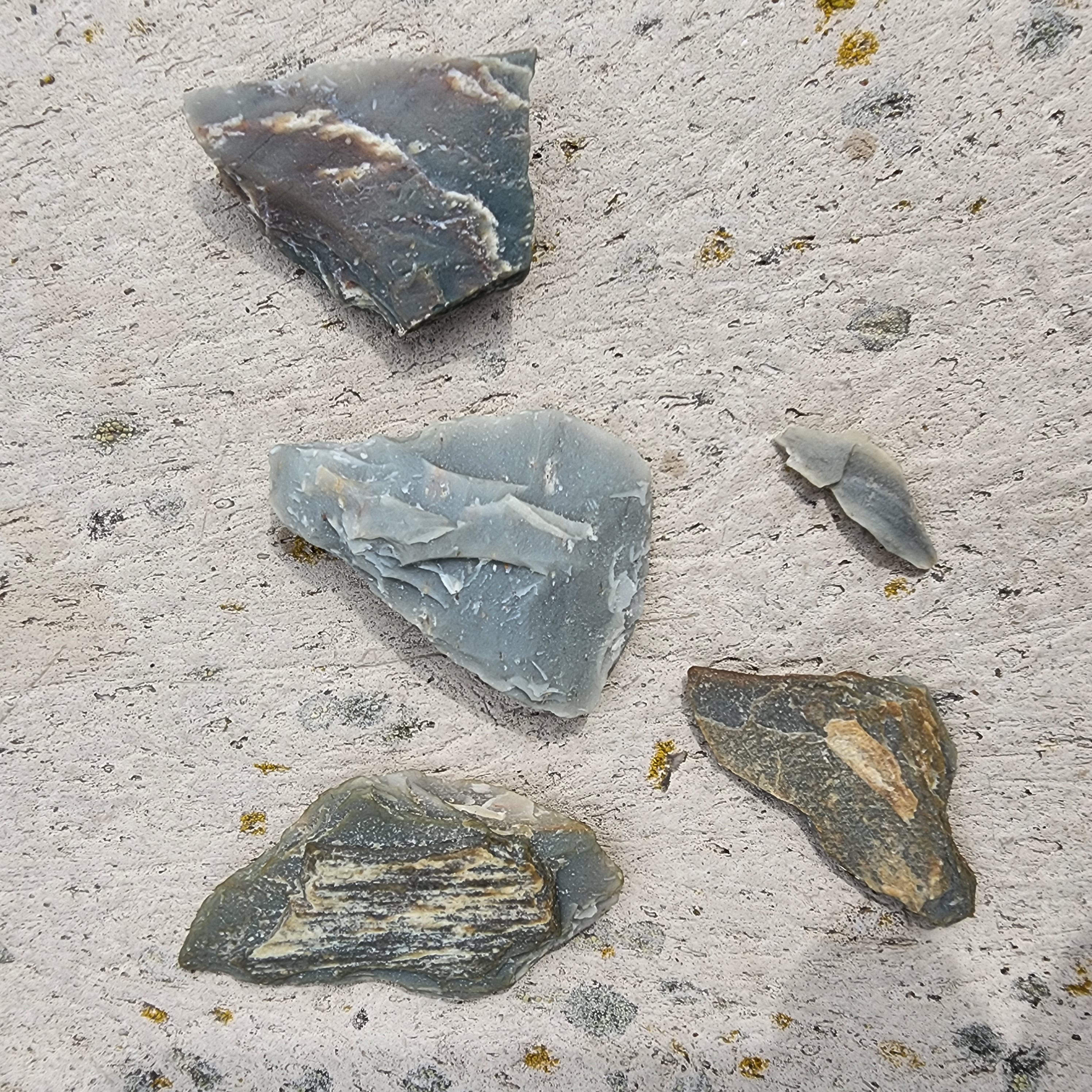 from top, left to right: large flake/blade, center - knapped on all edges - tool, right - piece of flint core, bottom - flakes.