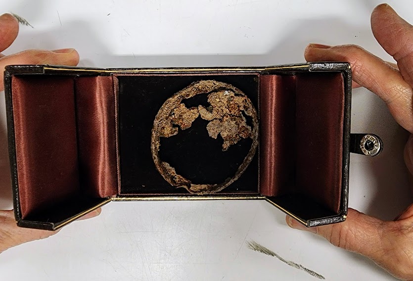 An antique piece of tin-can, rusted through, perhaps - I don't know, did she see a profile of the earth in it? I fancy I can Why this, in this satin lined case? And with this object, I'm perplexed, touched, it's beautiful, found art in it's purest form, clearly of immense value - a find - I know this, I value my finds as well - but the occasion of it I can only speculate. The circumstance is what matters here, and that is irretrievably lost.