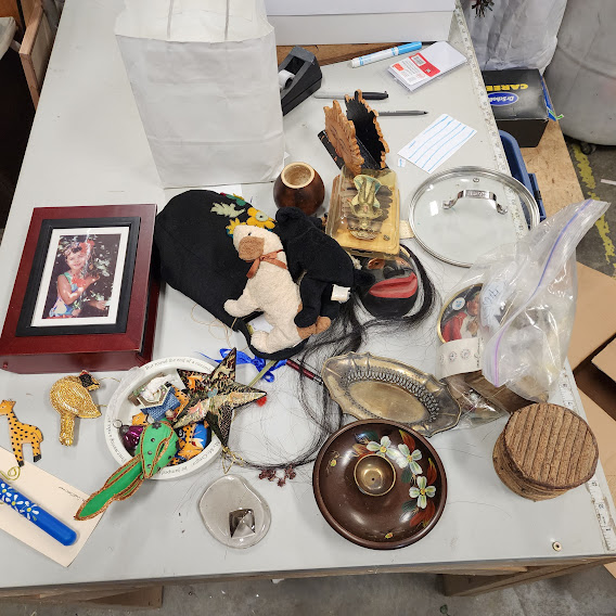 better than most boxes, there are personal items here, rare items of value...some antique jars, keys, a cloisonné salt shaker, jewelry, boxes of rubber stamps, art supplies, craft supplies, I'm guessing I would have liked her from the mish-mash of items, treasures, an antique jar filled with what I guessed were sea shells (they weren't), the cashier brings it back to me and shakes it into my hand..."What are these...?" he begins with horror - "Teeth? From what animal?" followed by ..."Four dollars???!!!" he says, trying to get me to share in his horror, he's young, probably doesn't know how expensive teeth are....The teeth, now that I look at them shaken into my hand, they're human. I tell him and he recoils , I inform him, that had he been to the dentist for the fine selection, quantity of teeth in my paw now; well, it would cost a damn site more than $4.00...I know, I've been.