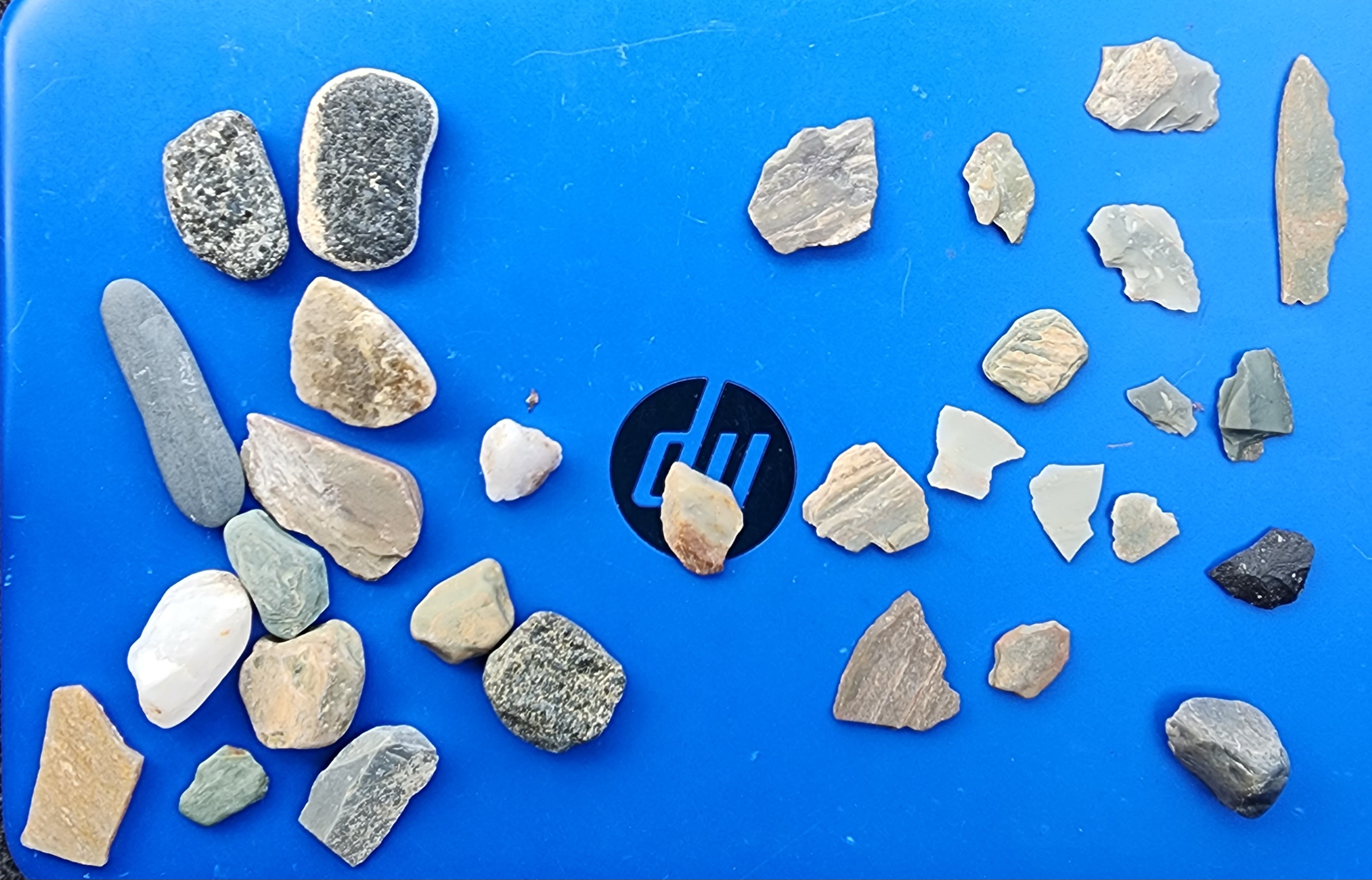 On the left side there's a few pieces of glittering black amphibole...a long rock, a piece of quartz that if polished would probably be crystal clear, a piece of smoky quartz, some unworked pieces of chert, and - my retirement plan, a flat rock that's shaped like Alberta. Lower left. Turn it around in your mind. Do you see it?