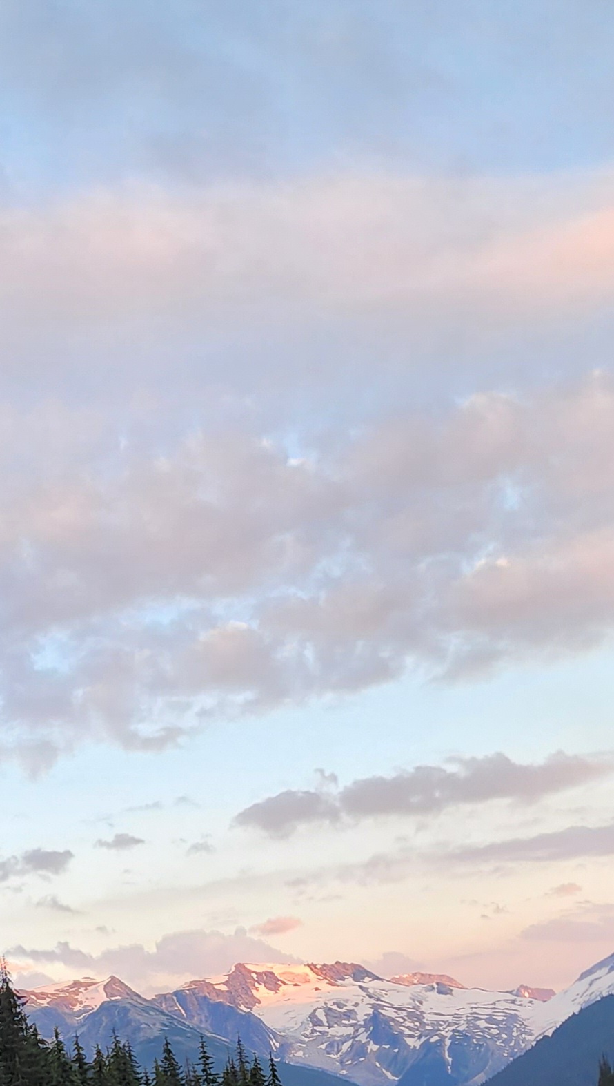 First night, north of Revelstoke, in the sight of Snow Covered Peaks, cool evening air in through the window.