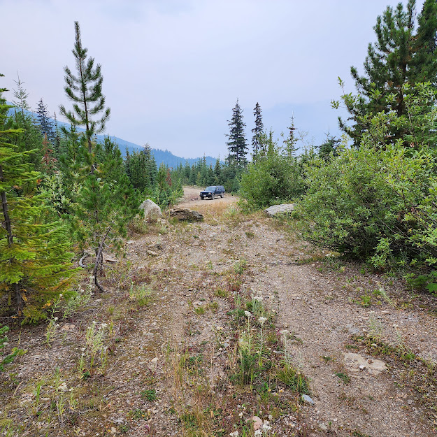 Morning finds me high up on an uncharted mountain, it takes some driving to find my bearings. And eventually I arrive at the "X" I've marked on the map, only to find there is no trail, the map is not the territory, and so this is a bust.