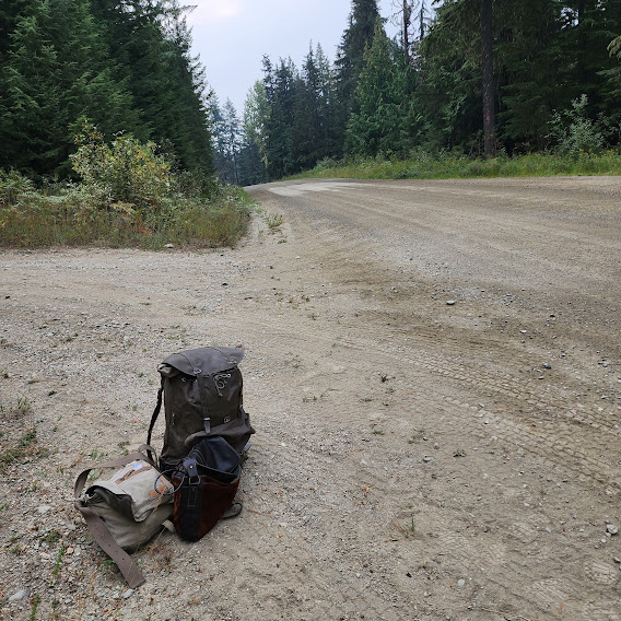 Down, down, down. It's a long walk. It takes about an hour and a half to get to the highway, the dirt road running around Trout Lake, set down my bags and wait.