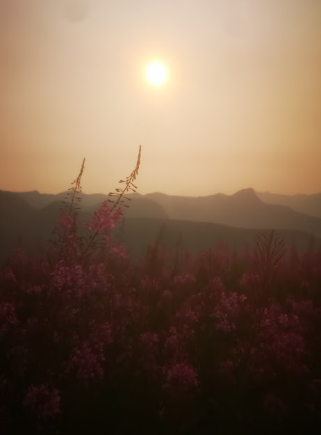 Time for a few photos. Trips up the mountain - the waving fireweed in the wind glitched my panorama mode - my phone/camera, dropped so often that really, I need a new one - but not now, not now.