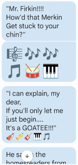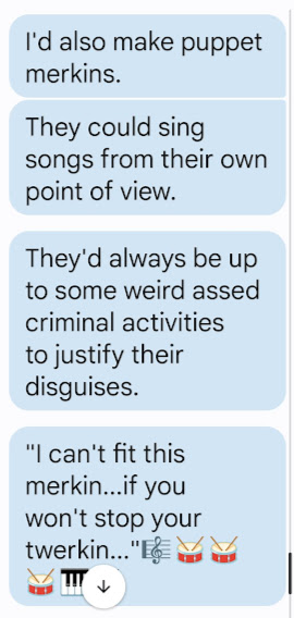I hear music. I bang on drum. I make noise.