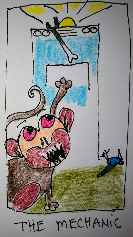This card represents evolution, the continual striving for perfection at the expense of others and greater dreams, the hope that the wrench might be able to fix the car. Travel is to be avoided. The human/simian features of the monkey suggest the evolution, that he would like to attempt the repair of your Volvo, only he is not yet certain which is the wrench end. The dead bird represents spirituality crushed by earthly ambition.