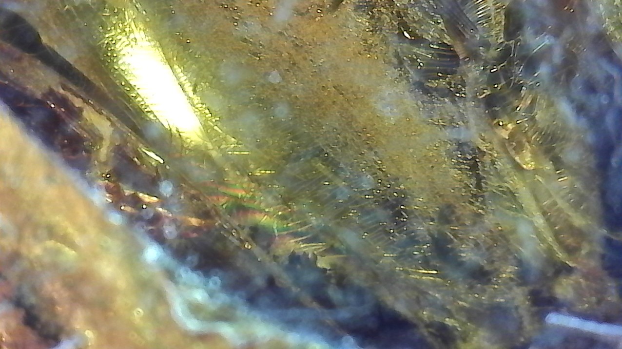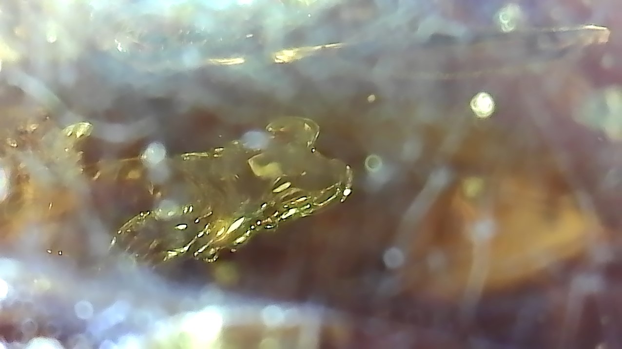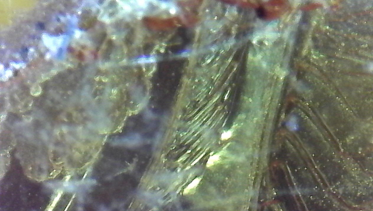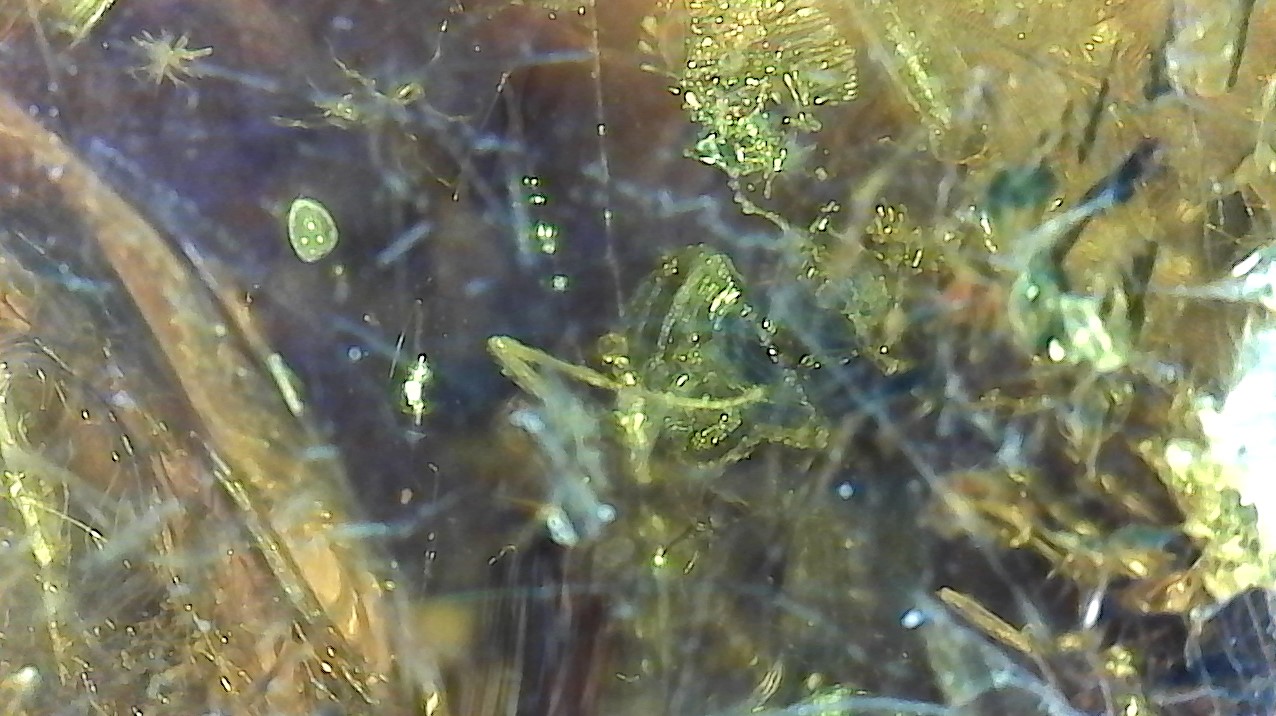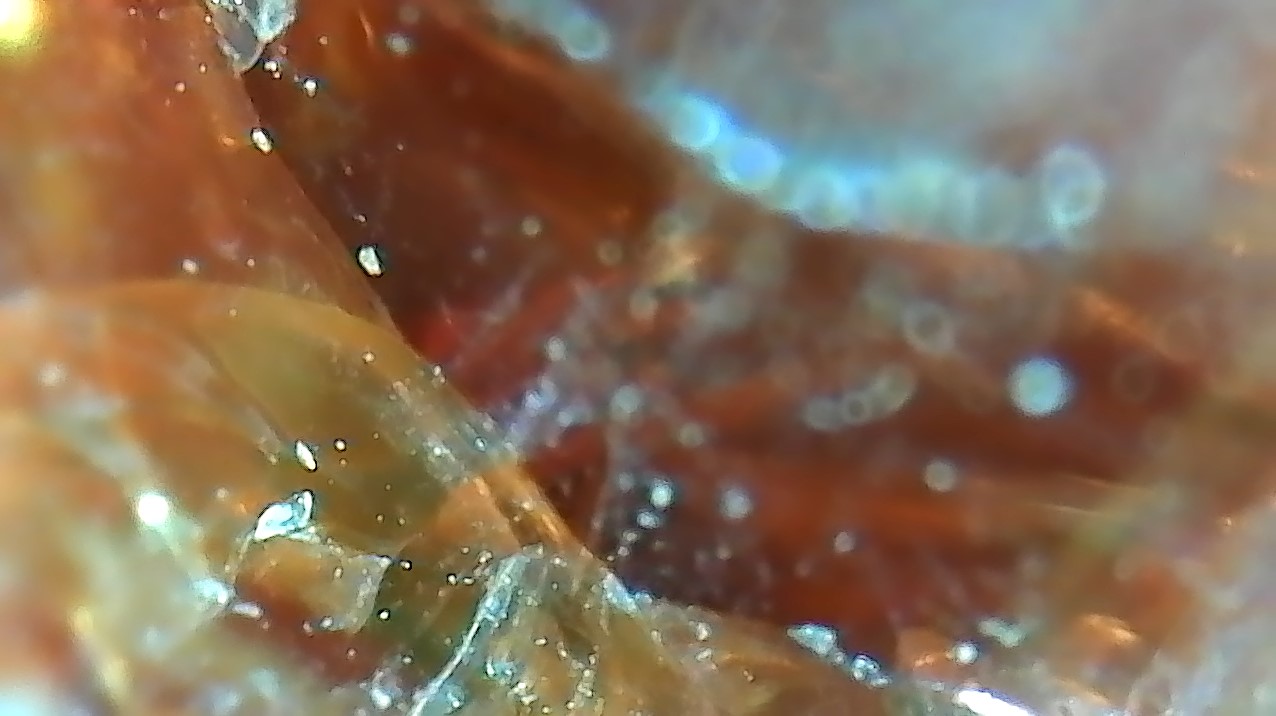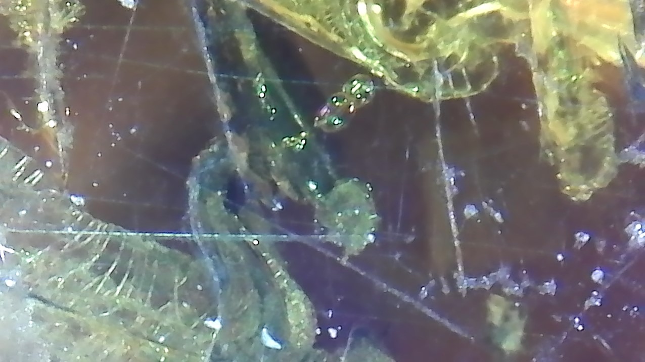 OK, OK, I'll leave it alone after this. An old piece of Baltic Amber I had with some flies as inclusions, thought it would be interesting under the microscope. It was. You can see the flies, wings, other inclusions - possible a spider, and what appear to be bits of feather.