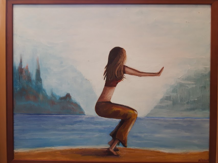 I mean, the vista looks local, as does the girl. Is she doing Yoga? Kung-Fu? Or is she preparing to ward off an attack from a bear, off screen? Was the artist an adoring boyfriend or a local woman who felt she needed to lose some weight and created this as part of her vision-board?