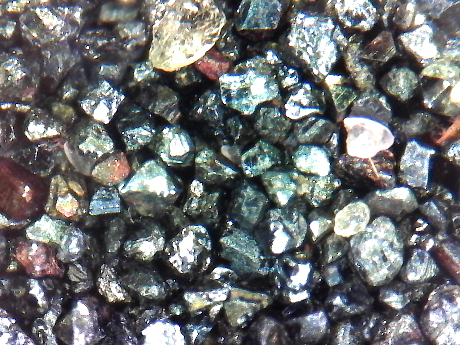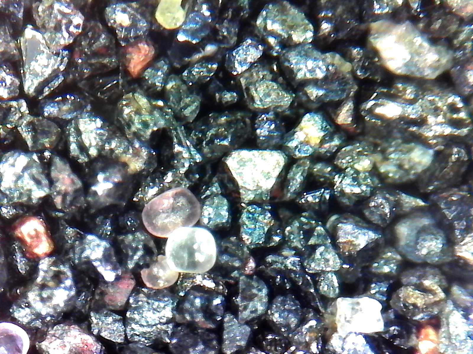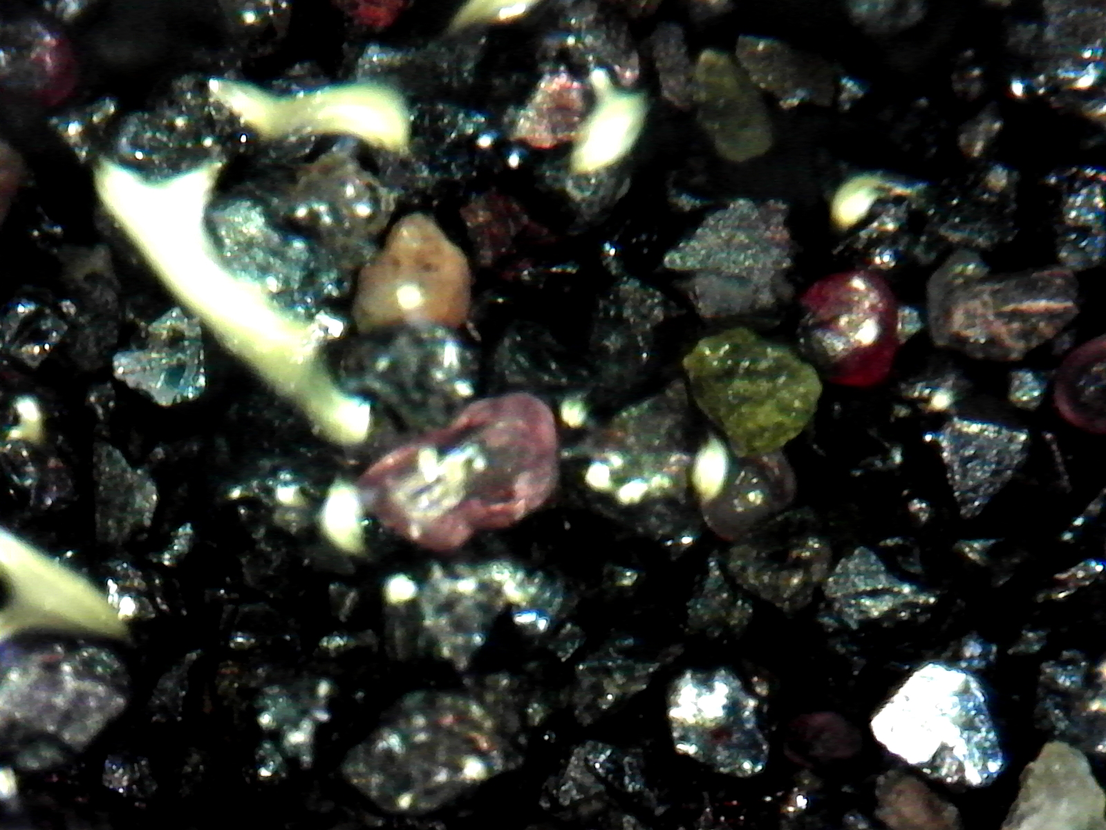 Above, some garnet, peridot/olivine, the dark pink might not be garnet, possibility of other gems...