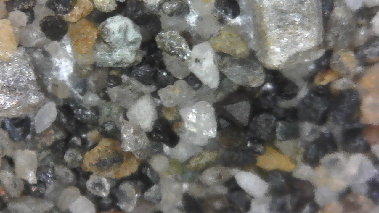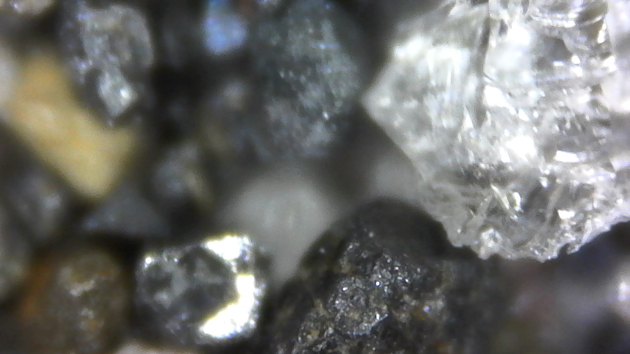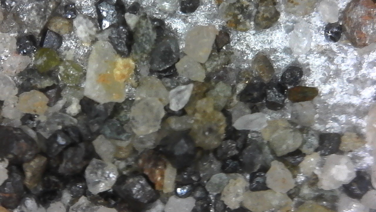 This, using my USB Microscope to examine the concentrates, the black triangular crystals have me puzzled, the clear - quartz, green - peridot, the rest?