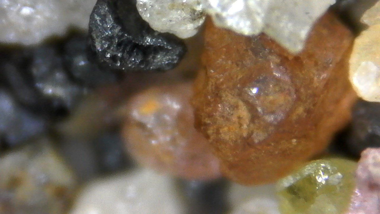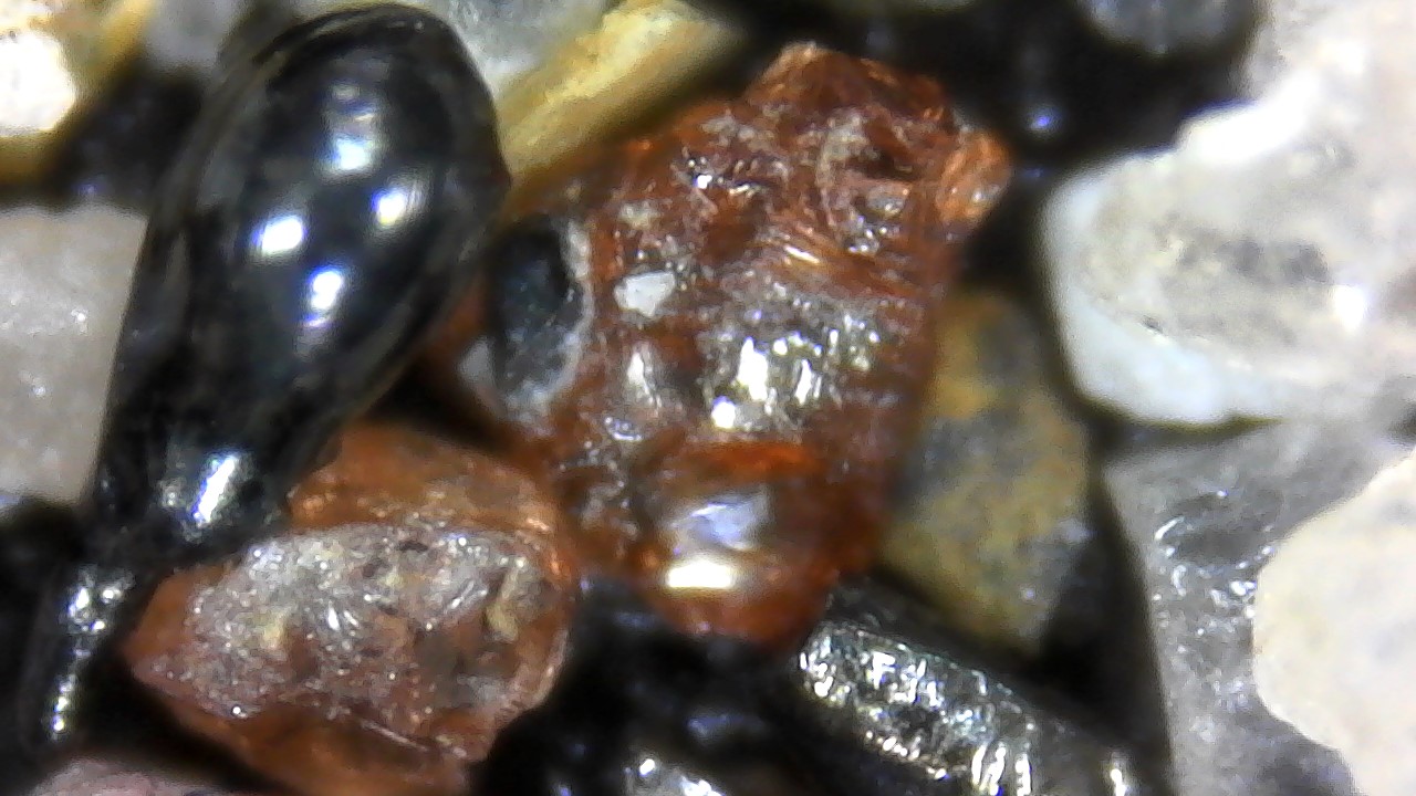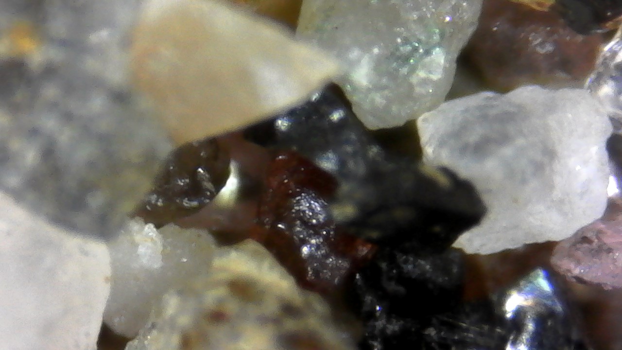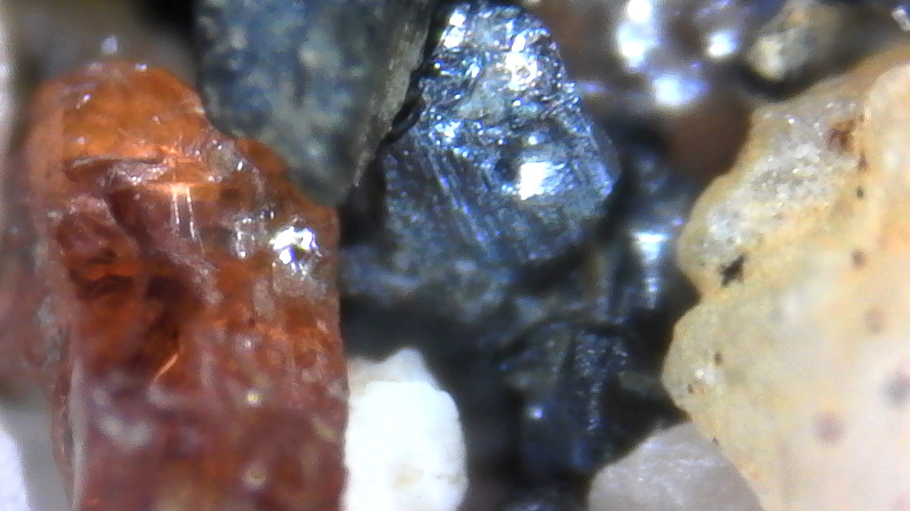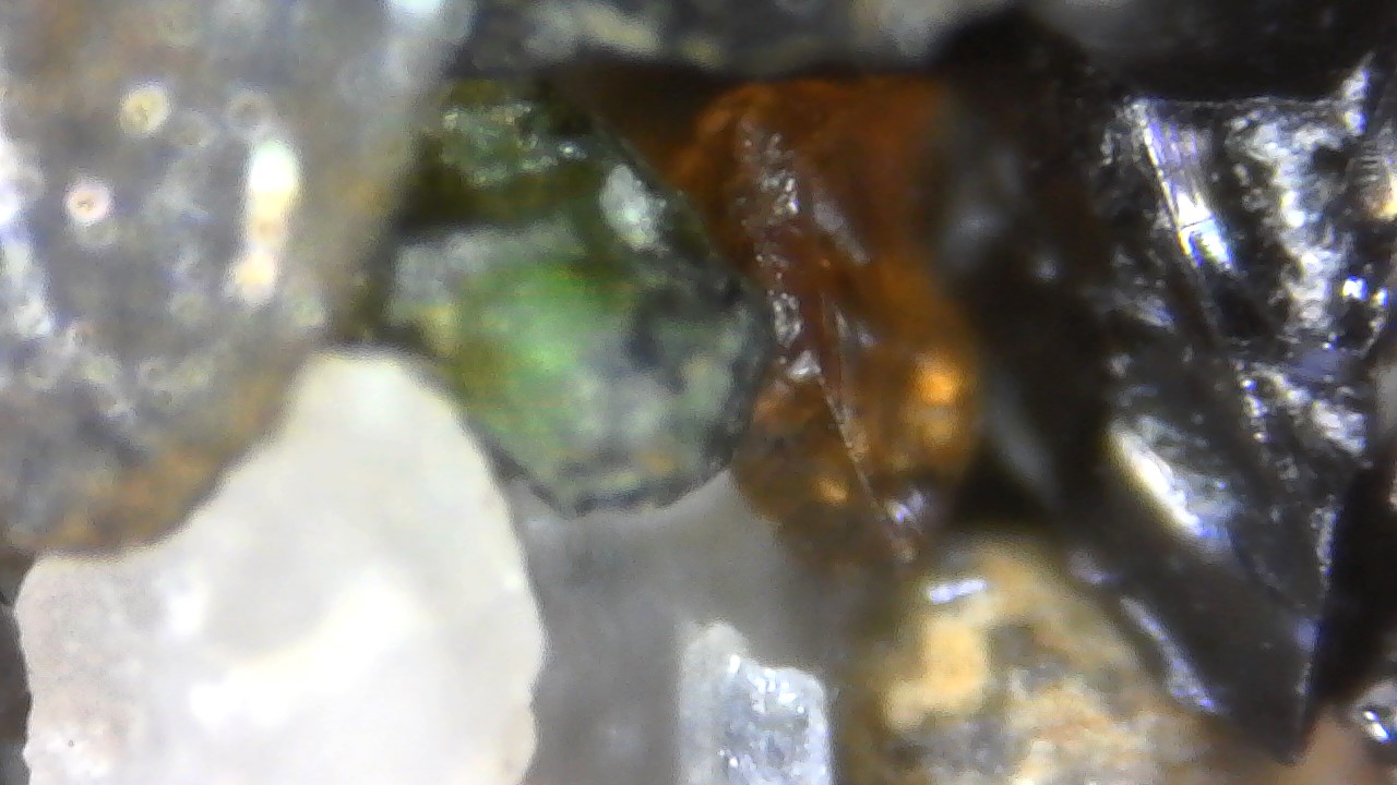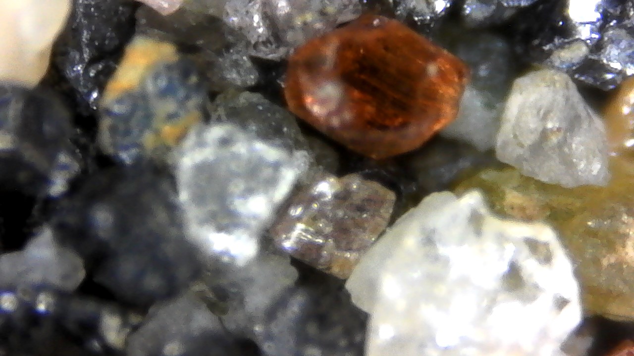 Pictured - under the USB microscope - abundant quartz, garnet, some what appears to be spessartine garnet (orange), hematite spheres (lots of those), various amphiboles, peridot, etc, etc.