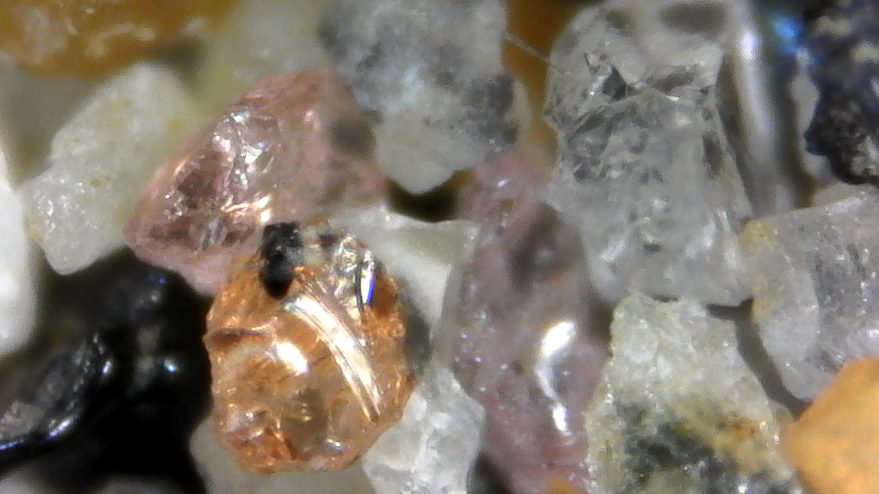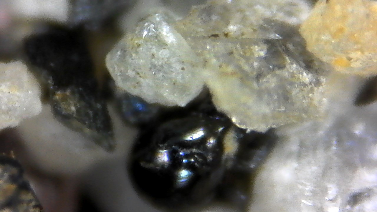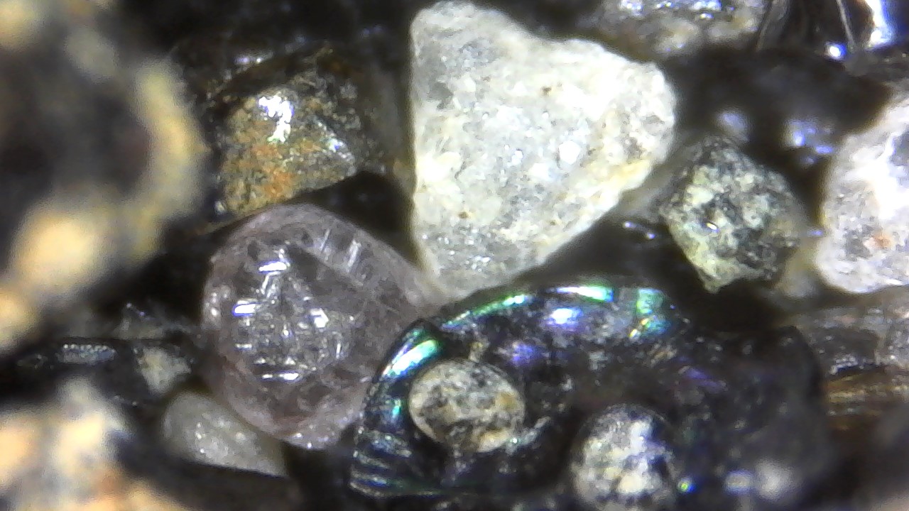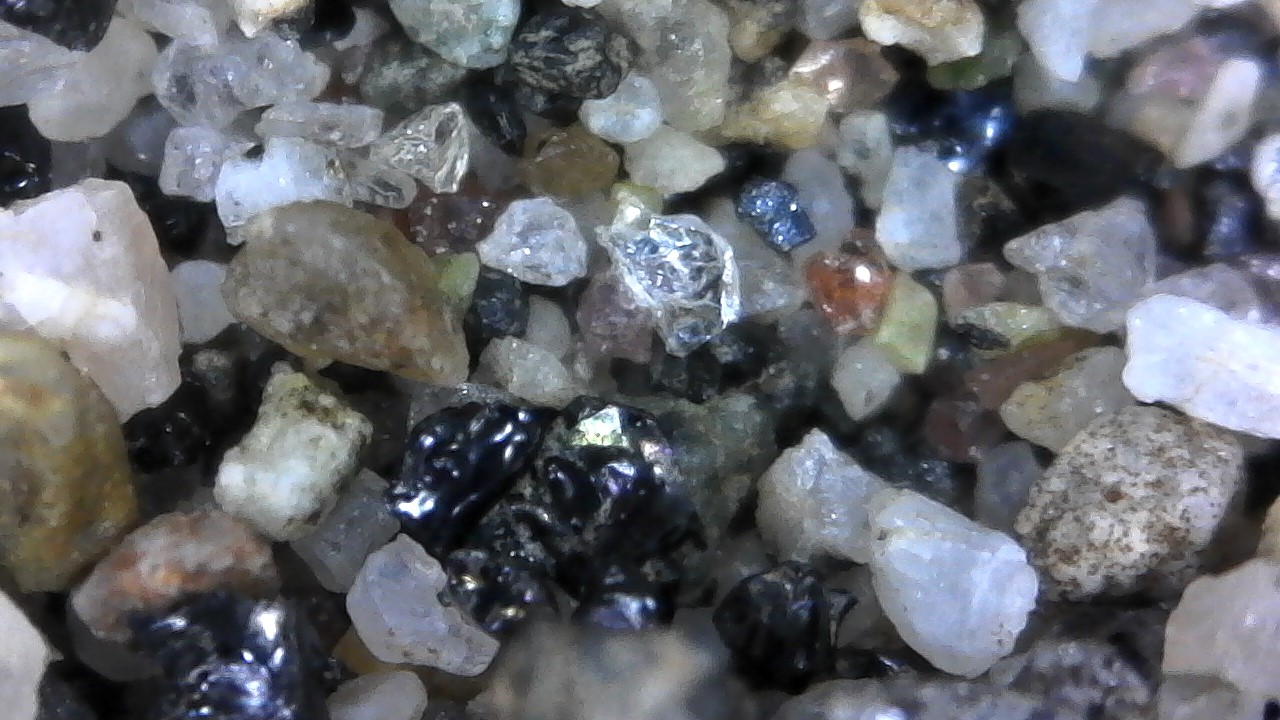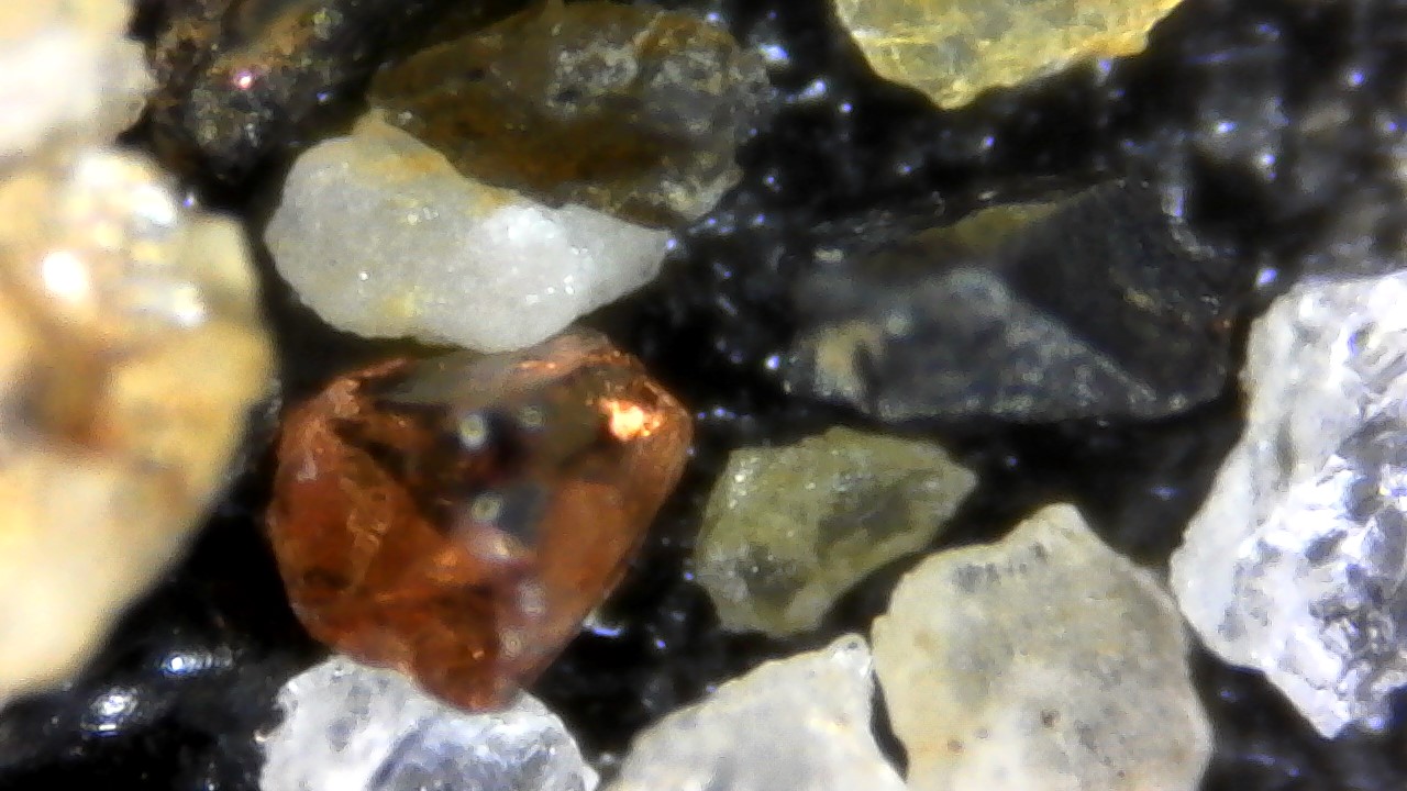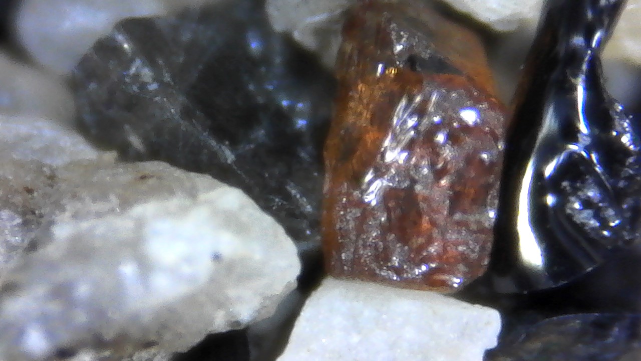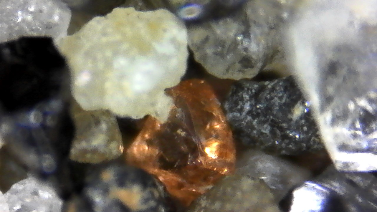 Pictured - under the USB microscope - abundant quartz, garnet, some what appears to be spessartine garnet (orange), hematite spheres (lots of those), various amphiboles, peridot, etc, etc.