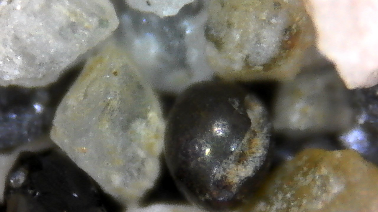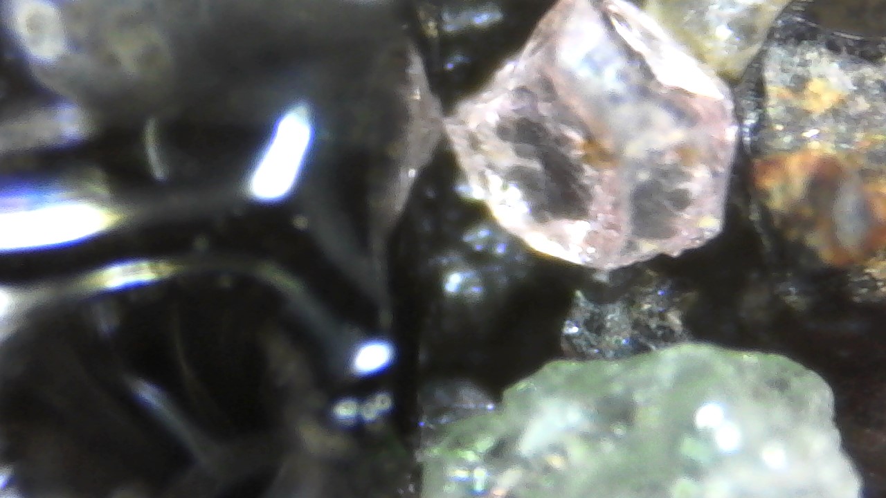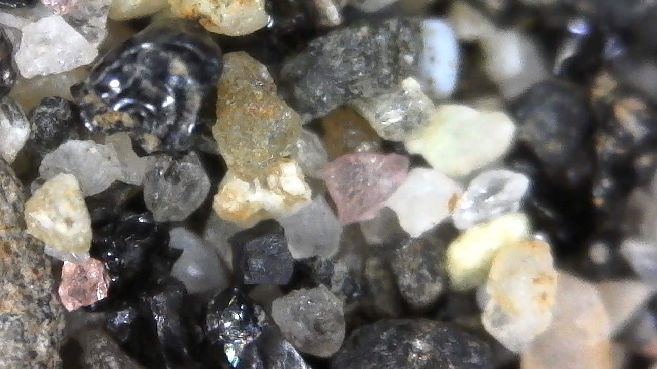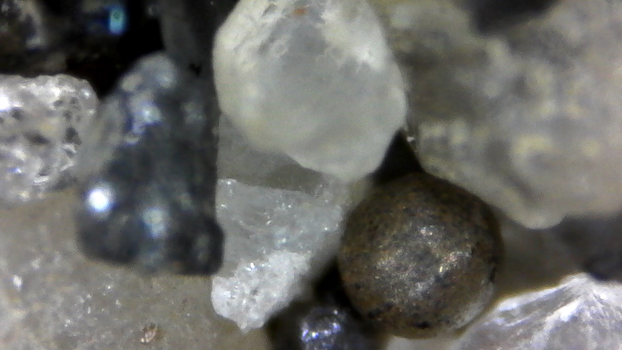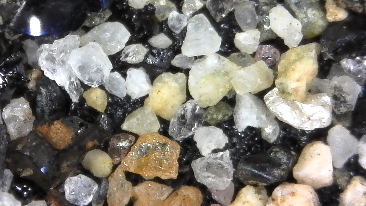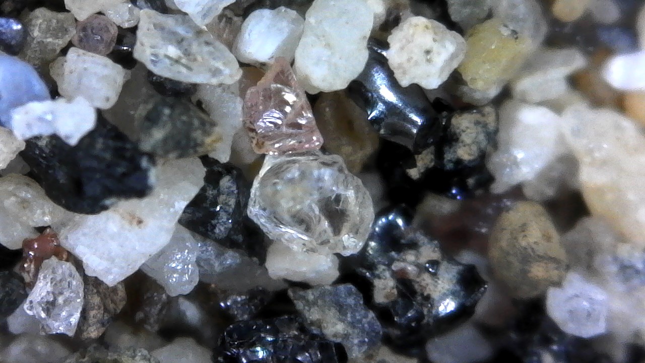 Pictured - under the USB microscope - abundant quartz, garnet, some what appears to be spessartine garnet (orange), hematite spheres (lots of those), various amphiboles, peridot, etc, etc.