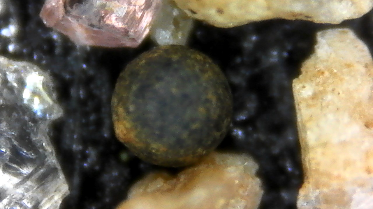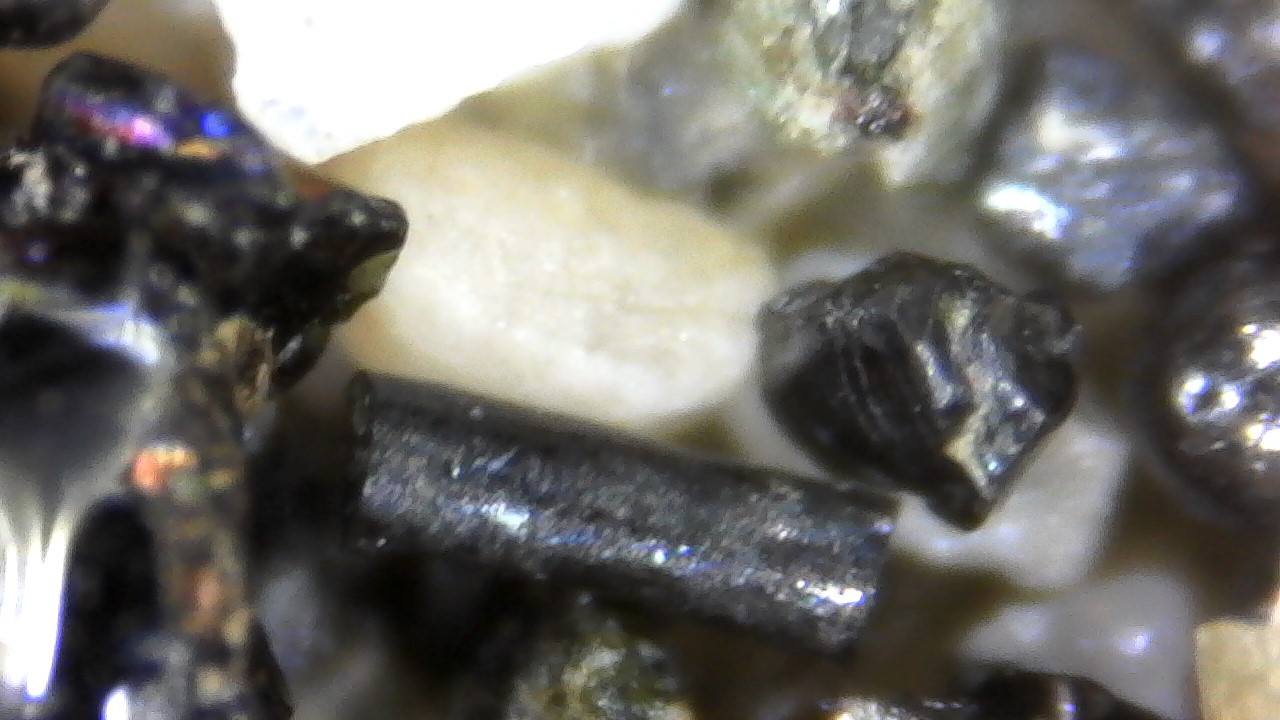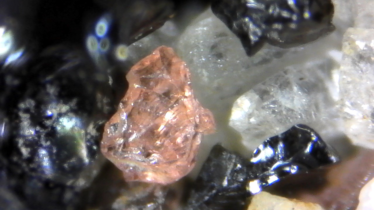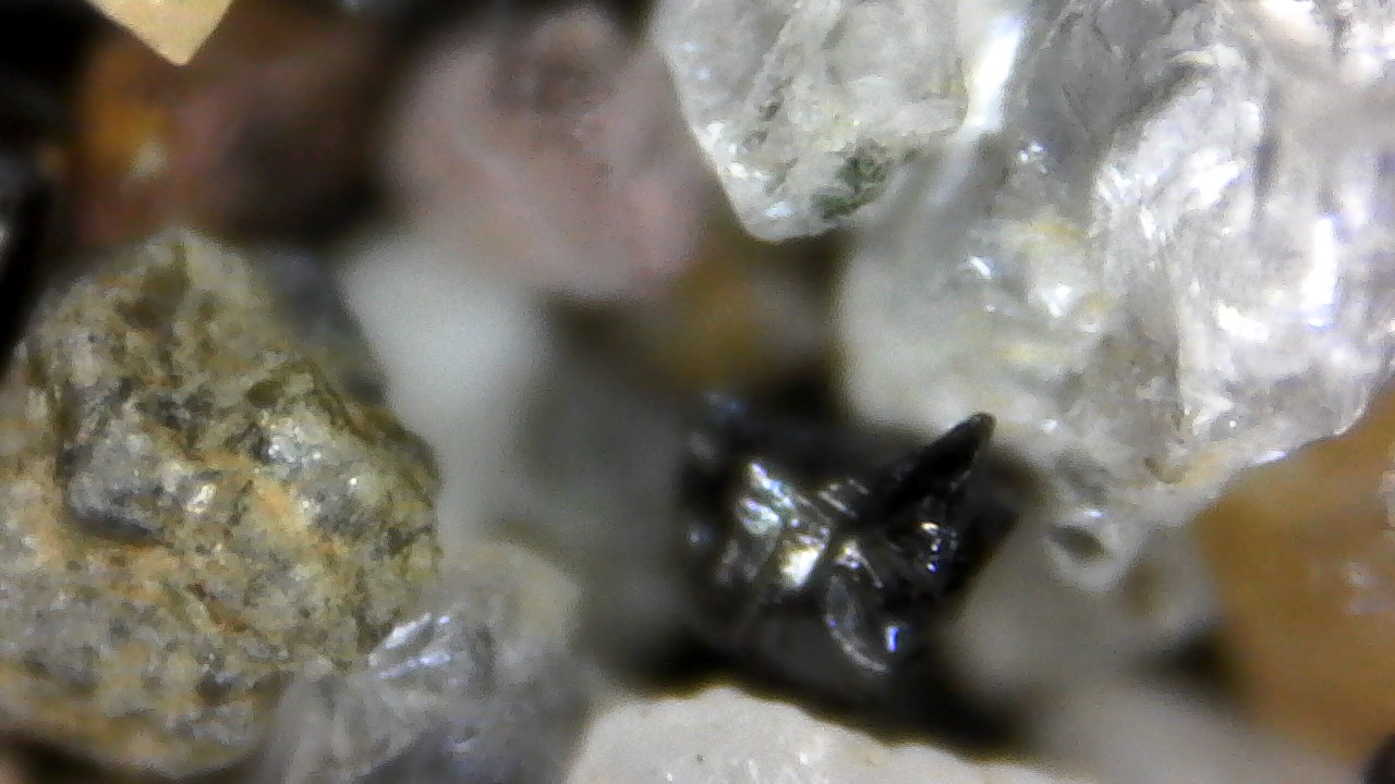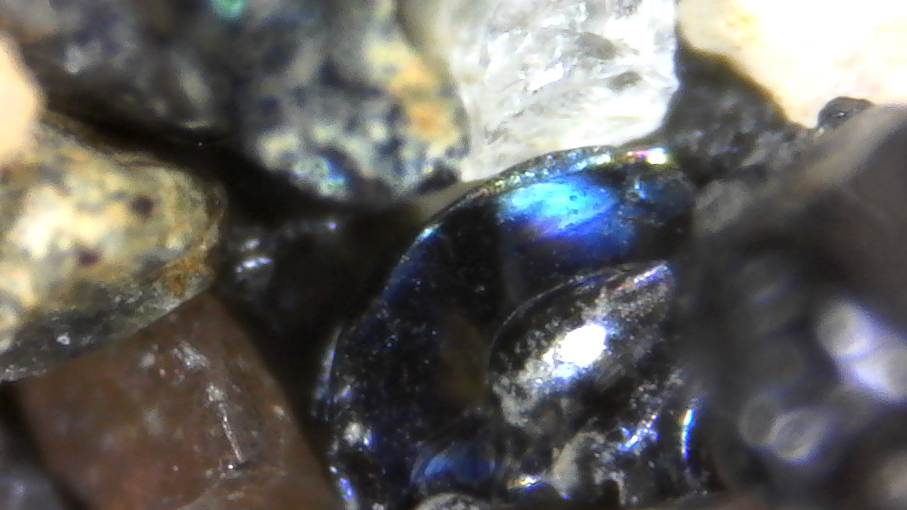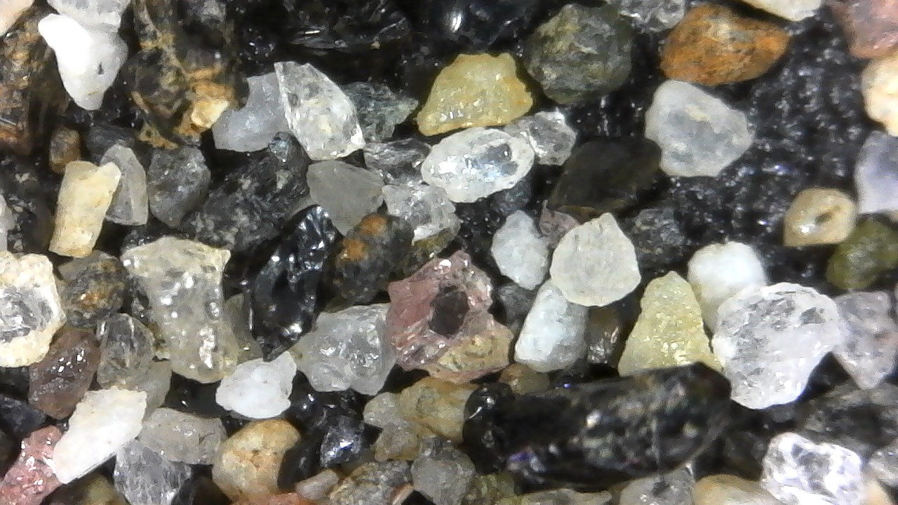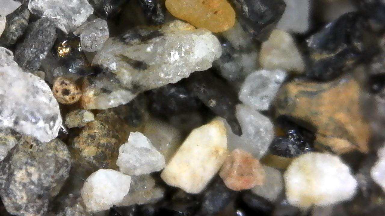 Pictured - under the USB microscope - abundant quartz, garnet, some what appears to be spessartine garnet (orange), hematite spheres (lots of those), various amphiboles, peridot, etc, etc.