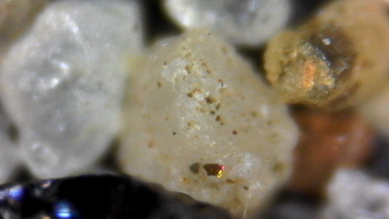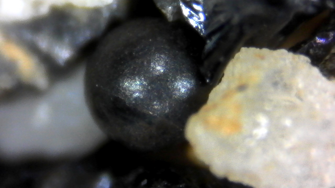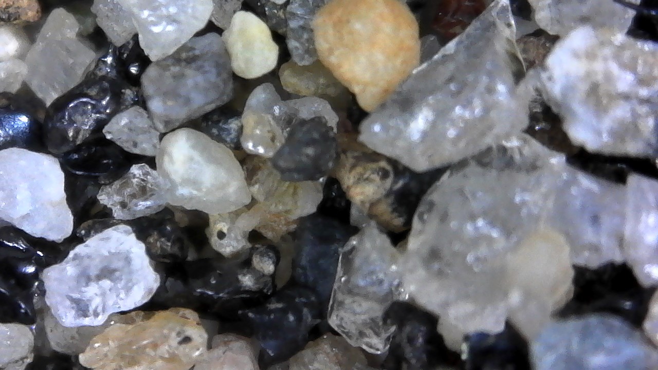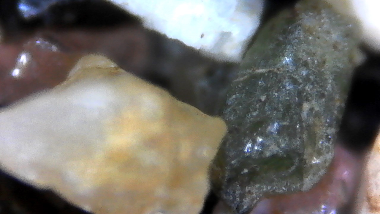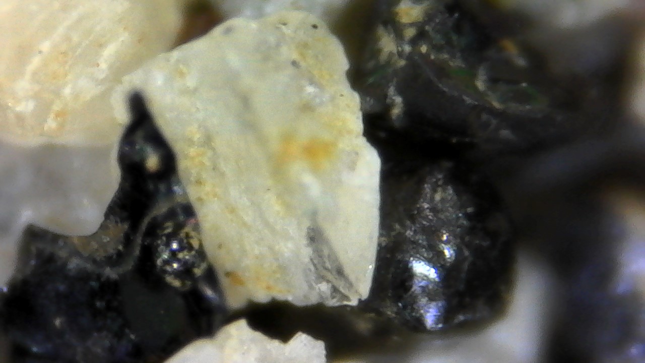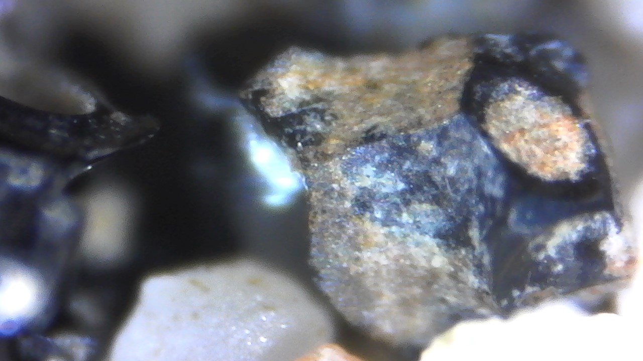 Pictured - under the USB microscope - abundant quartz, garnet, some what appears to be spessartine garnet (orange), hematite spheres (lots of those), various amphiboles, peridot, etc, etc.