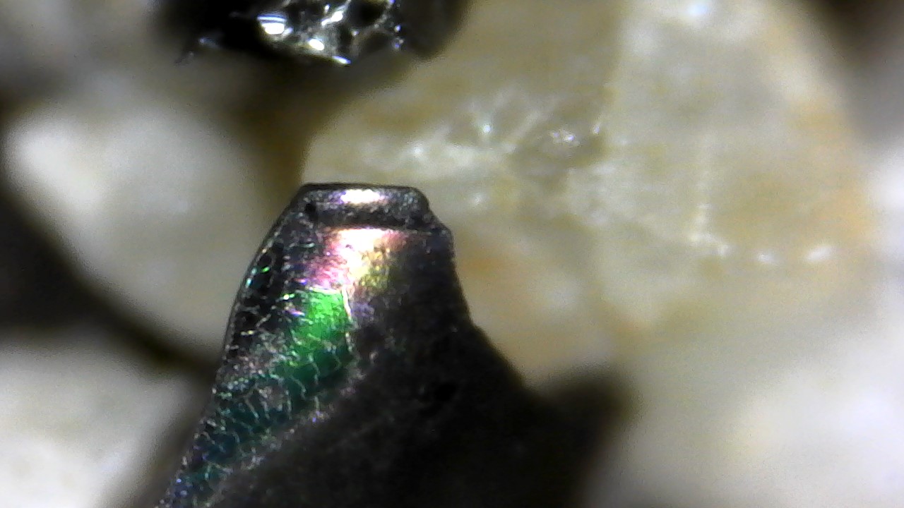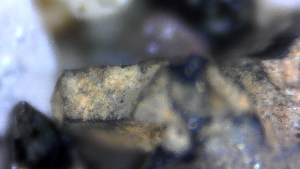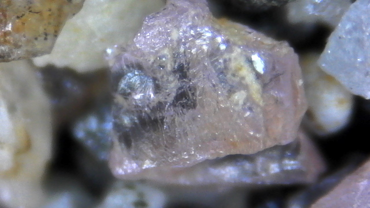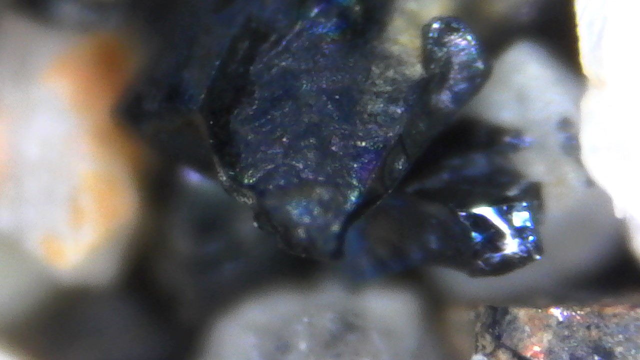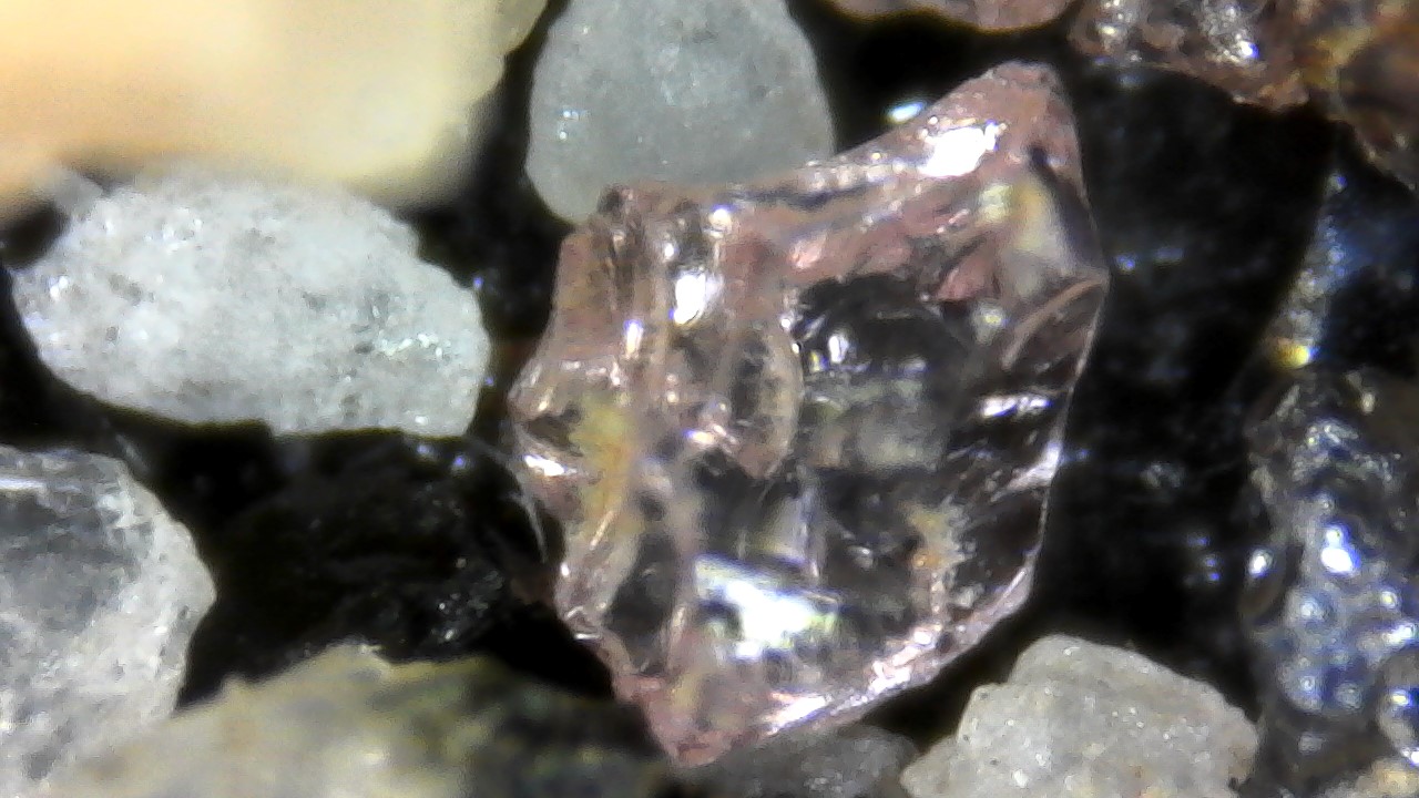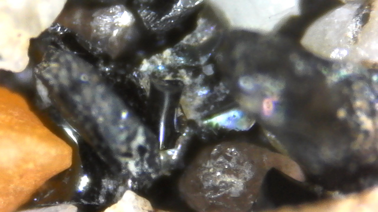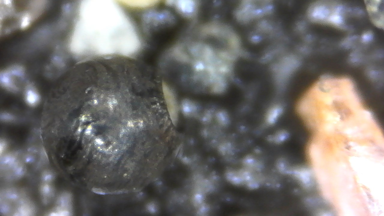 Pictured - under the USB microscope - abundant quartz, garnet, some what appears to be spessartine garnet (orange), hematite spheres (lots of those), various amphiboles, peridot, etc, etc.
