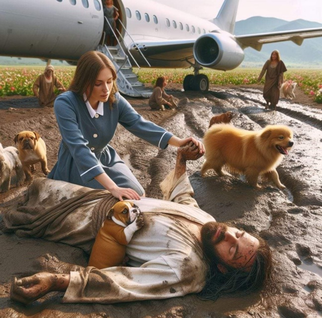 Another one. Jesus carrying a little Asian Child from the Tulip Paddies of Amsterdam. With his dogs.