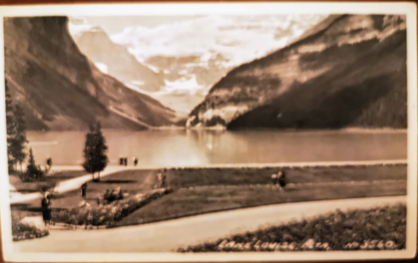 An old postcard of Lake Louise, a bit blurry, sorry, I can't retake the picture as it's already been sent. But notice how few people...those were the days. Now you have to line up just to get a view of the lake, and by merely being there you're the wallpaper to countless "influencers" and a part of every new immigrant families photo album.