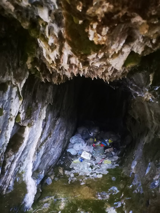 Mine number #1, never would have seen this from the highway, but walking it becomes apparent. Note the Stalactites forming on the ceiling. And, note the trash in the back (it ends just out of site of the flash). Who does this? "Honey, I'm just running my trash 10 km out of town to a hole I found in a cliff...it'll save us a dollar on the collection!!"