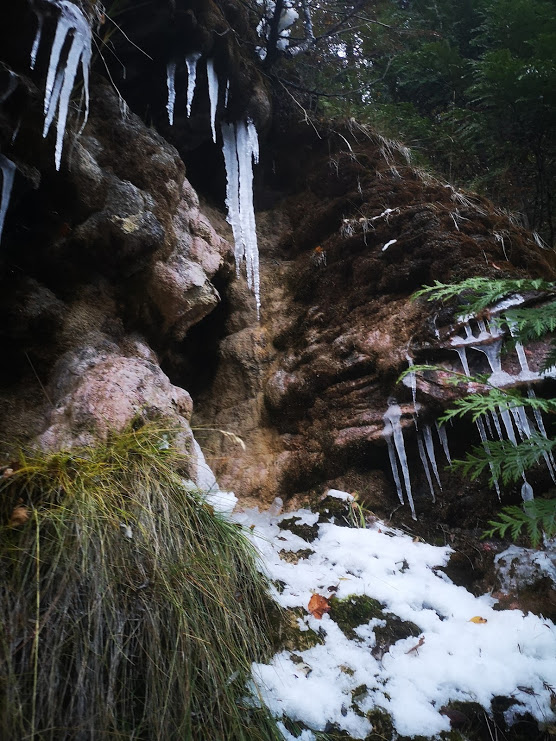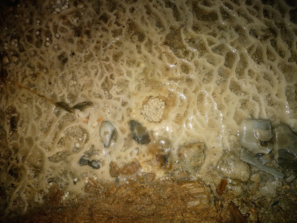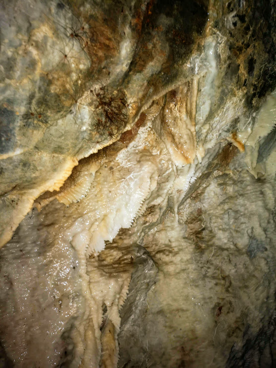 Another mine, a few yards deeper - further up the road. Again, invisible from the highway at driving speed. This one has in the back formed some beautiful calcite terraces and "cave pearls". All this in probably a hundred short years..